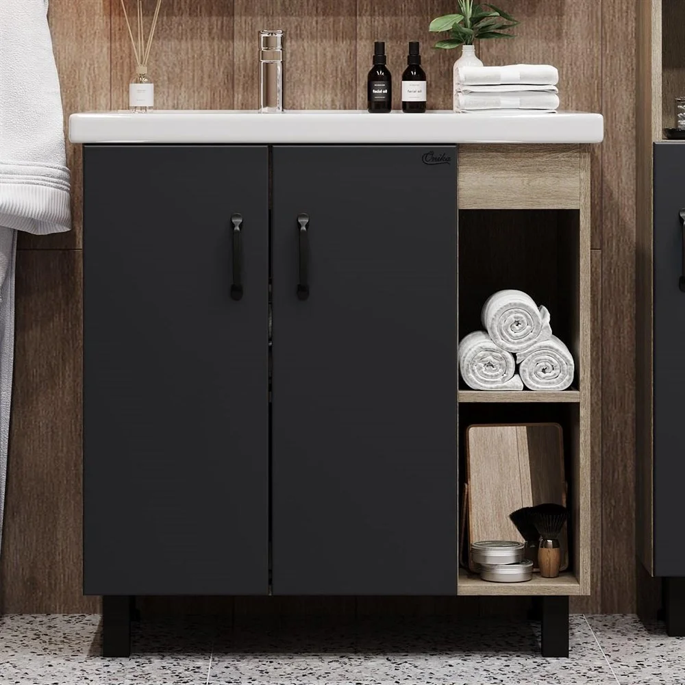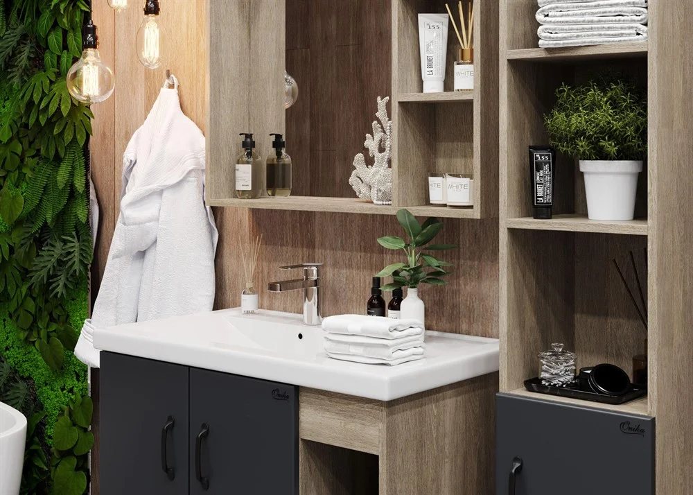 В тумбе Onika ТИМБЕР 70.10 удачно сочетаются контрастные цвета и фактуры: серый матовый фасад с покрытием SoftTouch, корпус цвета дуба с роскошной текстурой, черная матовая металлическая фурнитура.