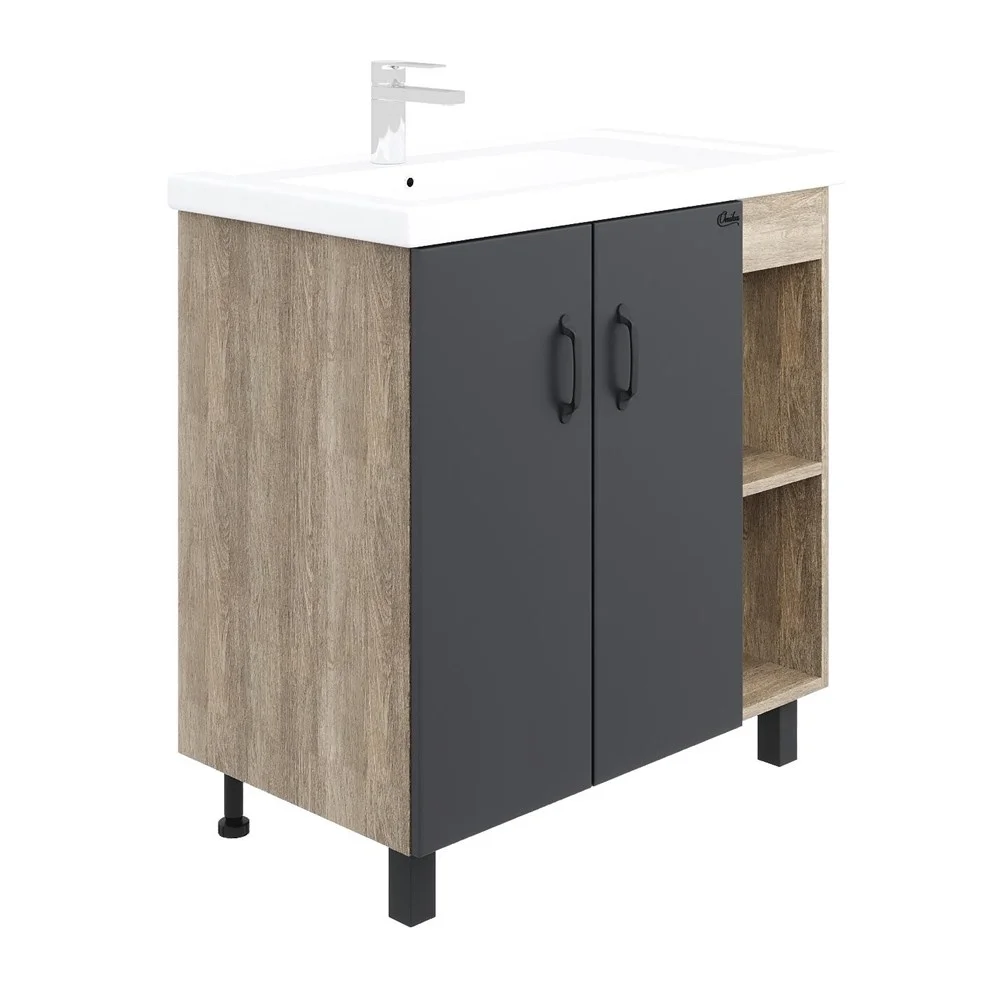 В тумбе Onika ТИМБЕР 70.10 удачно сочетаются контрастные цвета и фактуры: серый матовый фасад с покрытием SoftTouch, корпус цвета дуба с роскошной текстурой, черная матовая металлическая фурнитура.