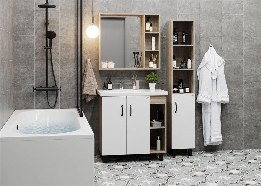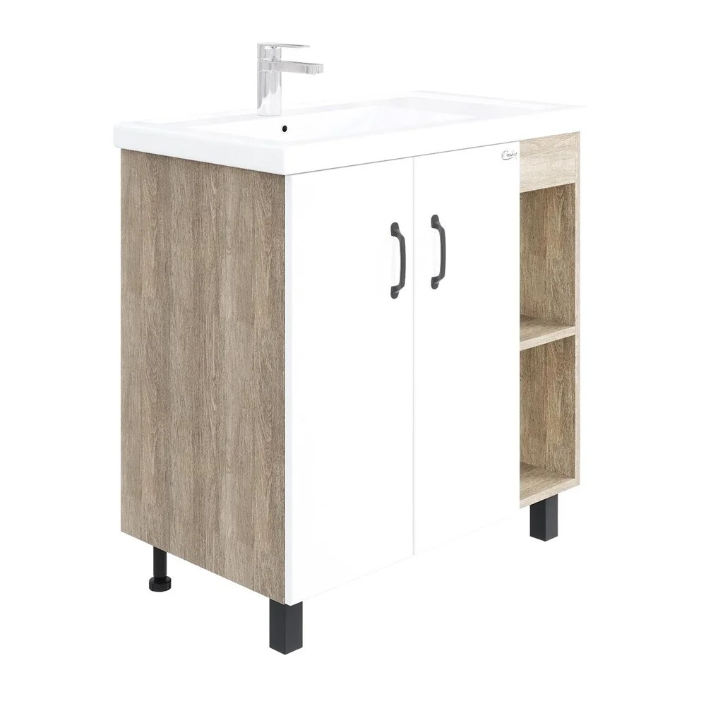 В тумбе Onika ТИМБЕР 80.10 удачно сочетаются контрастные цвета и фактуры: белый матовый фасад с покрытием SoftTouch, корпус цвета дуба с роскошной текстурой, черная матовая металлическая фурнитура.