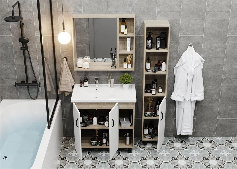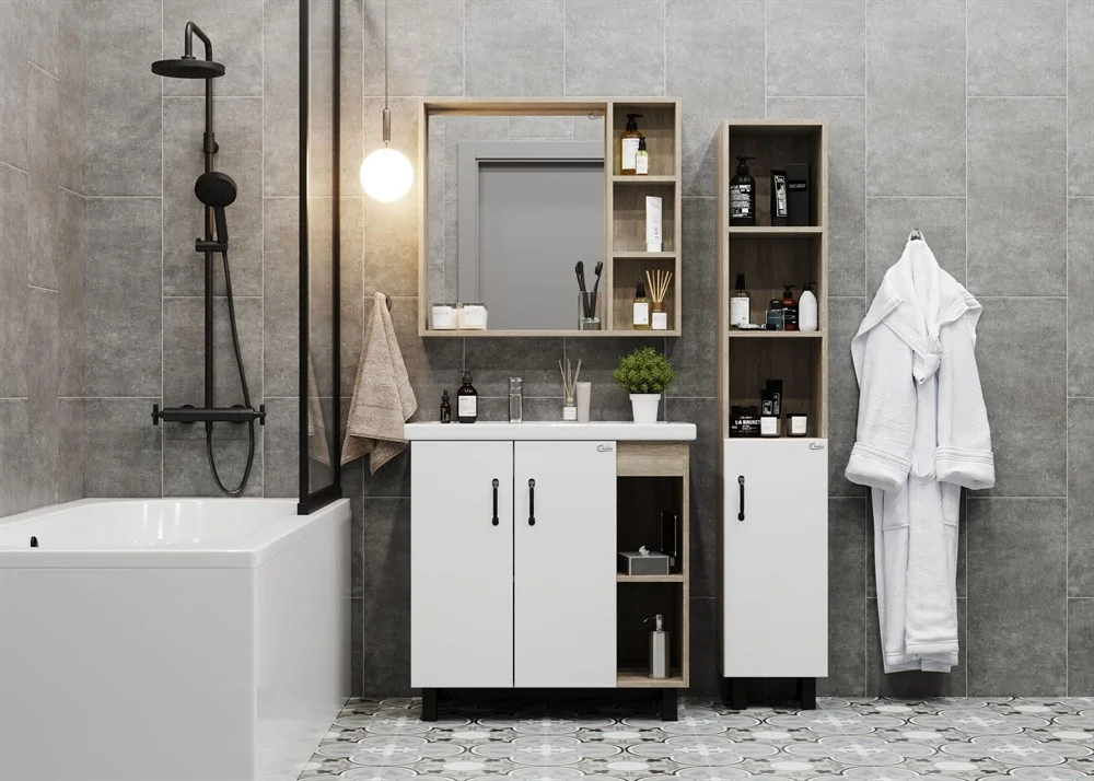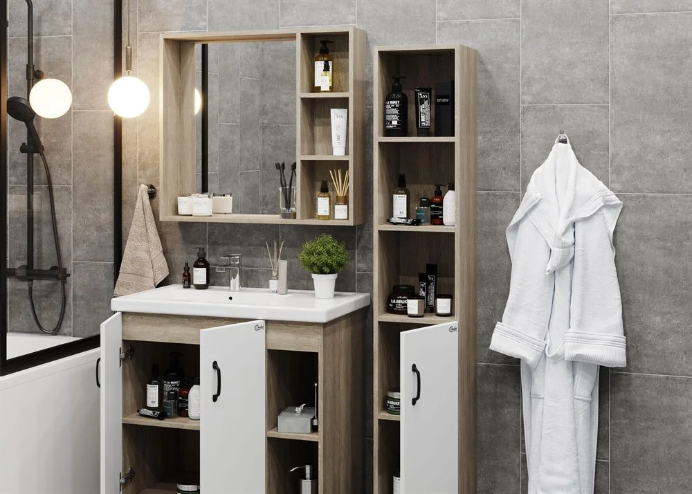 Открытые полки справа обеспечивают быстрый доступ к часто используемым аксессуарам, а пространство за распашными дверцами слева, снабженными системой плавного закрывания, станет удобным местом для хранения различных бытовых принадлежностей.