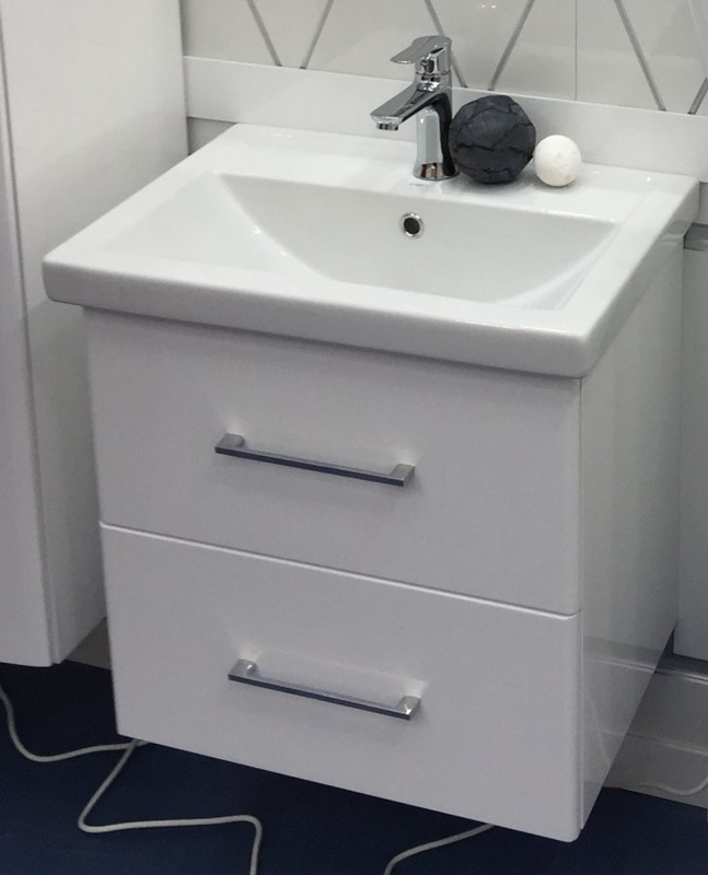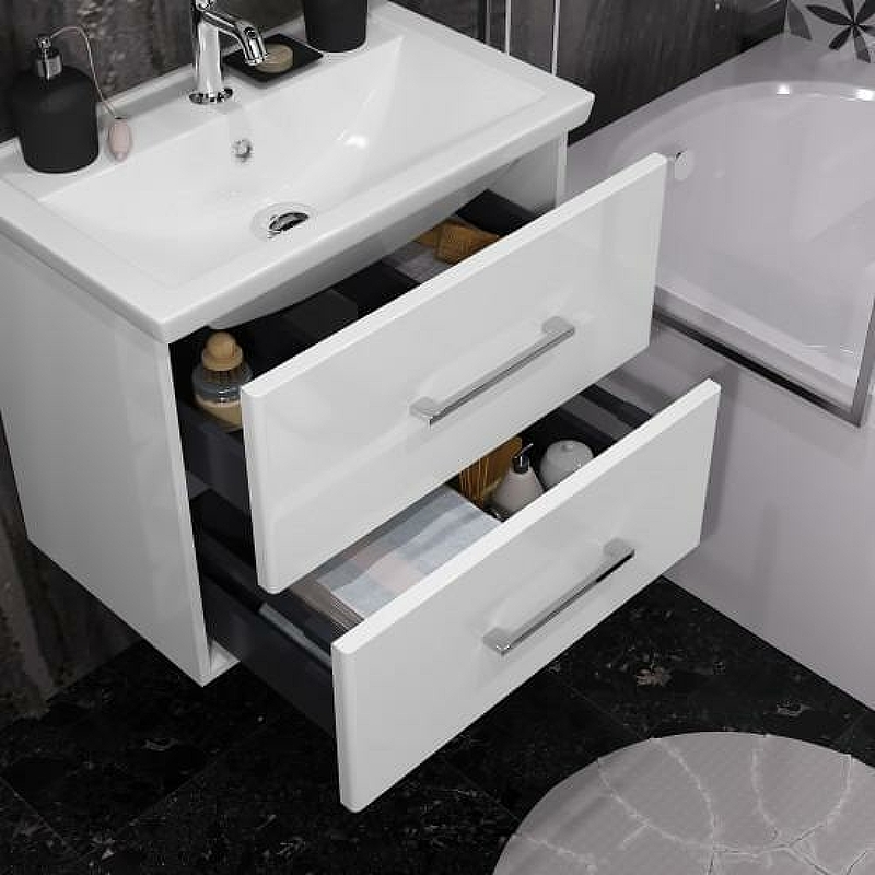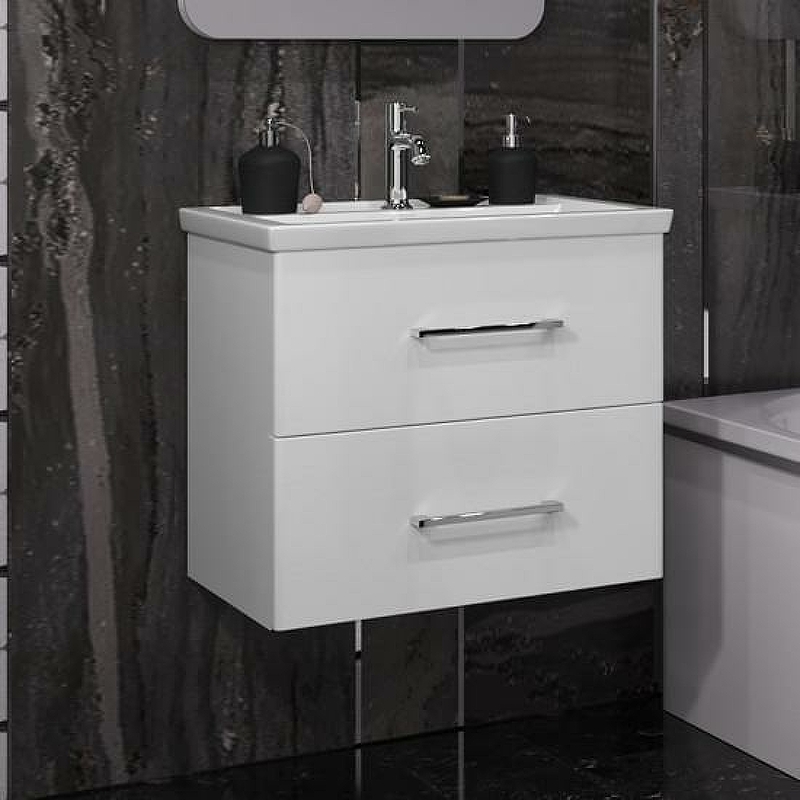 Подвесная тумба прямоугольной формы с изящной ручкой, двумя выдвижными ящиками с системой «плавного закрывания», глубокой керамической раковиной и зеркалом.