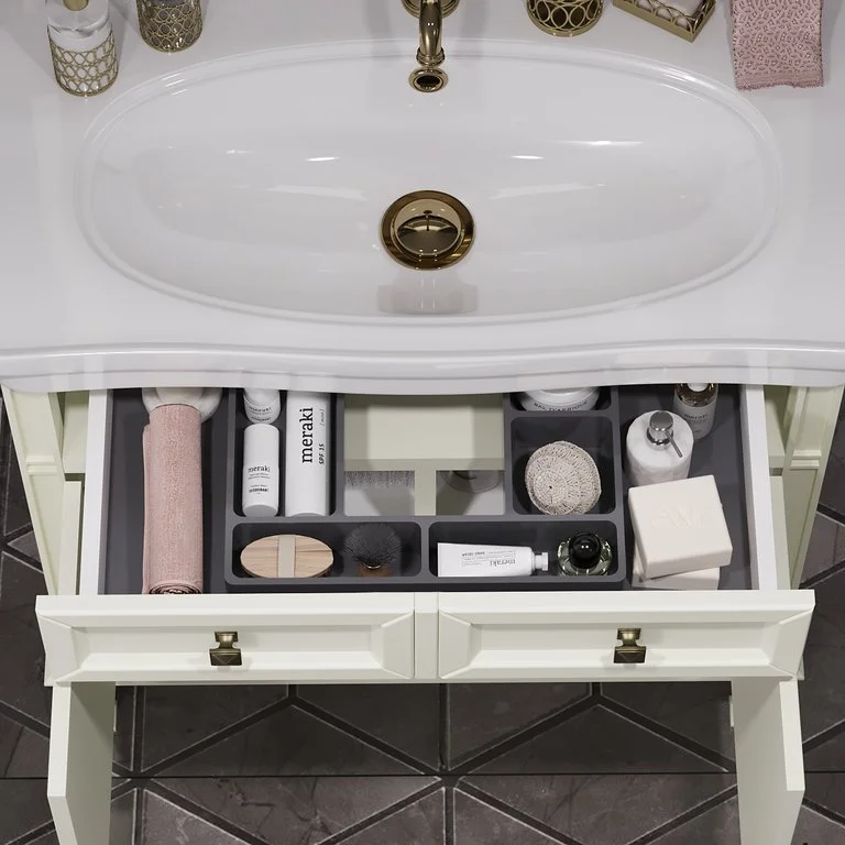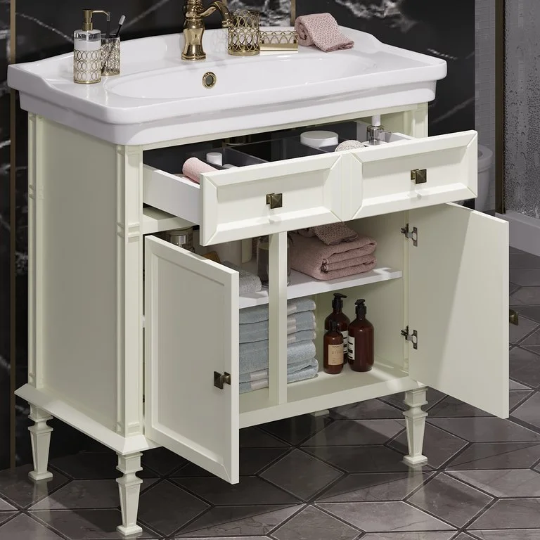 Коллекцию КАНТАРА характеризует филигранная фрезеровка ножек в итальянском стиле и шикарная глубокая керамическая раковина — столешница в размерах 85 или 105 см.