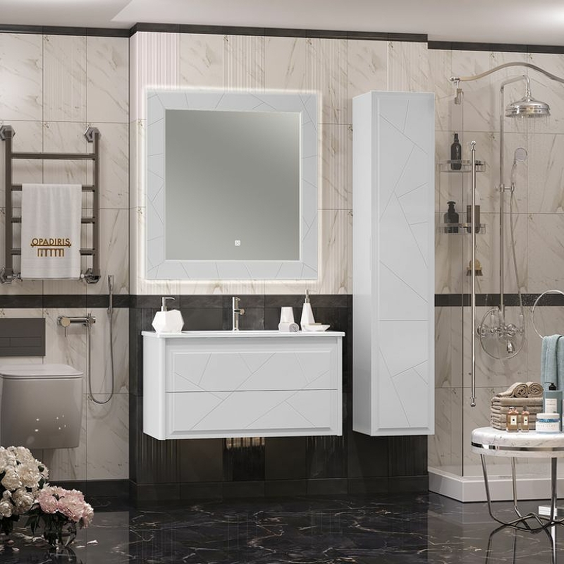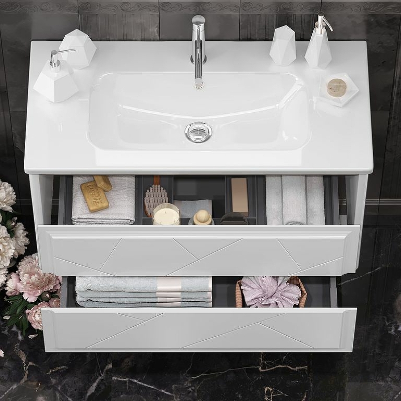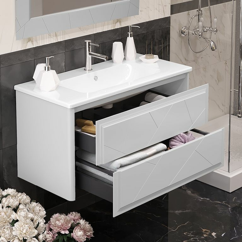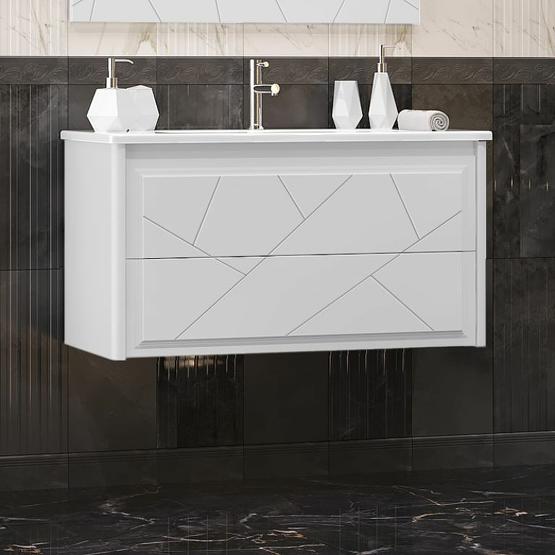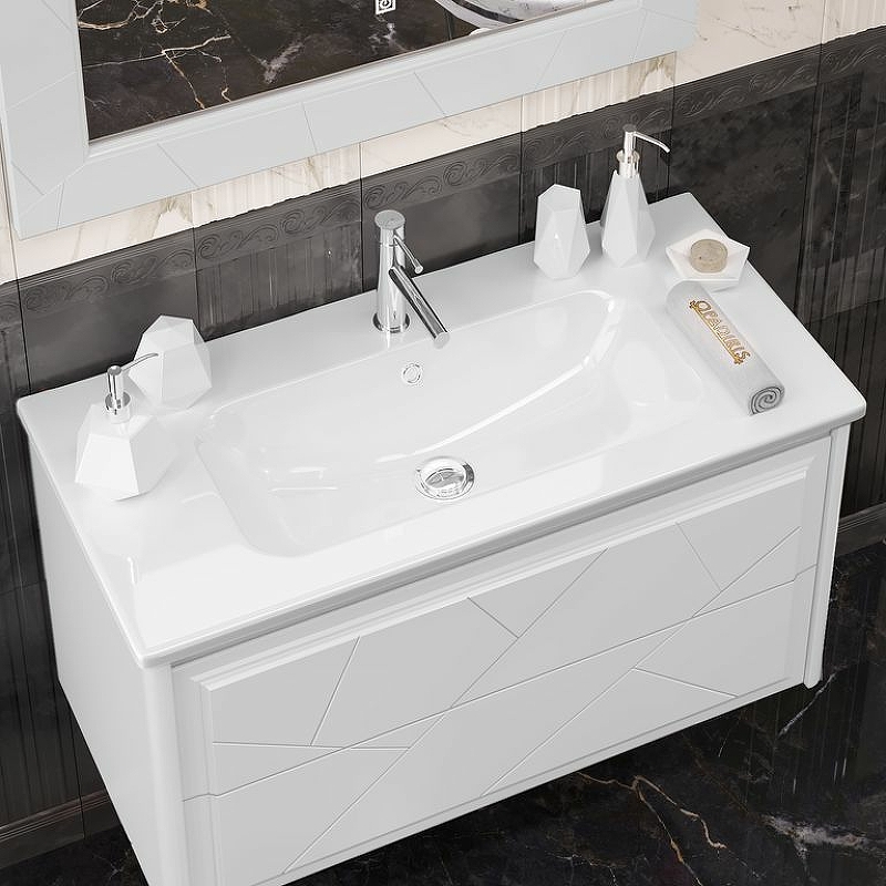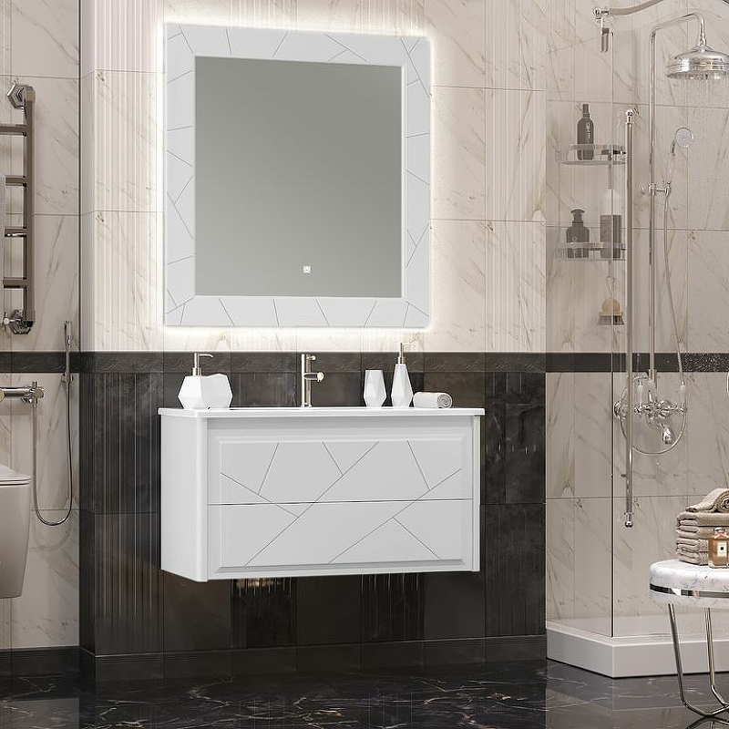 Коллекцию ЛУИДЖИ украшают сложная фрезеровка фасадов строгими линиями и декоративная подсветка по периметру зеркала, которое оснащено сенсорным выключателем. Тумбы дополняются современными ультратонкими керамическими слим-раковинами в размерах 70 см и 90 см.