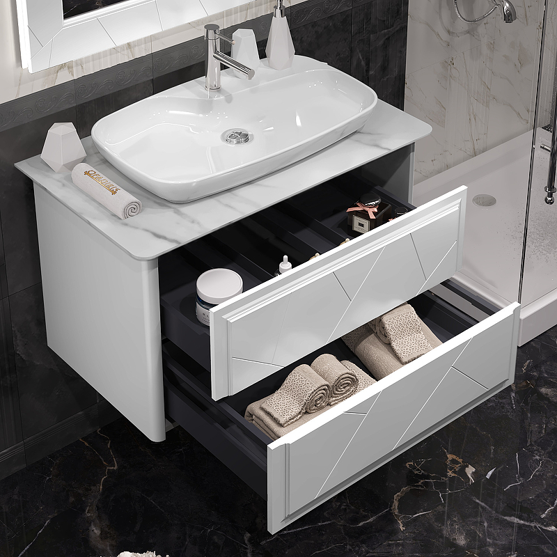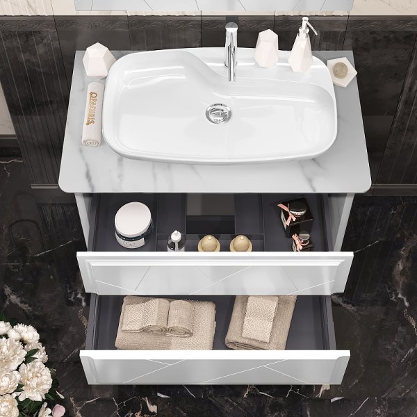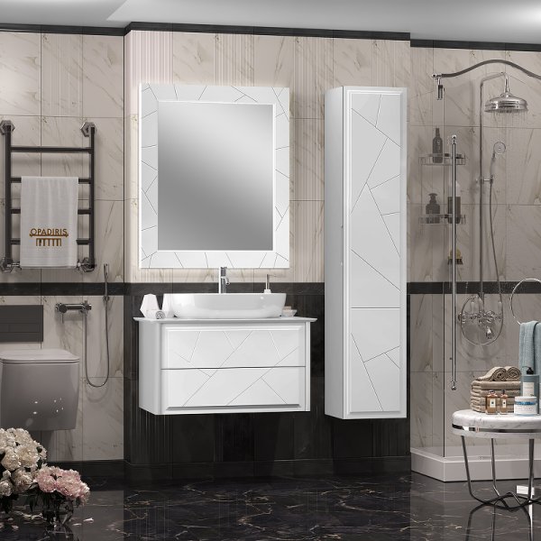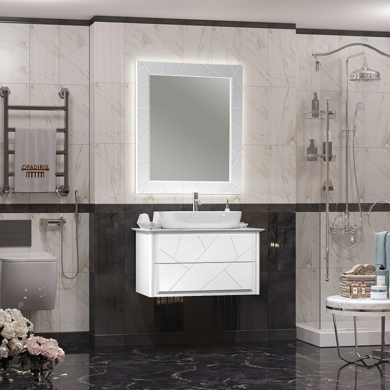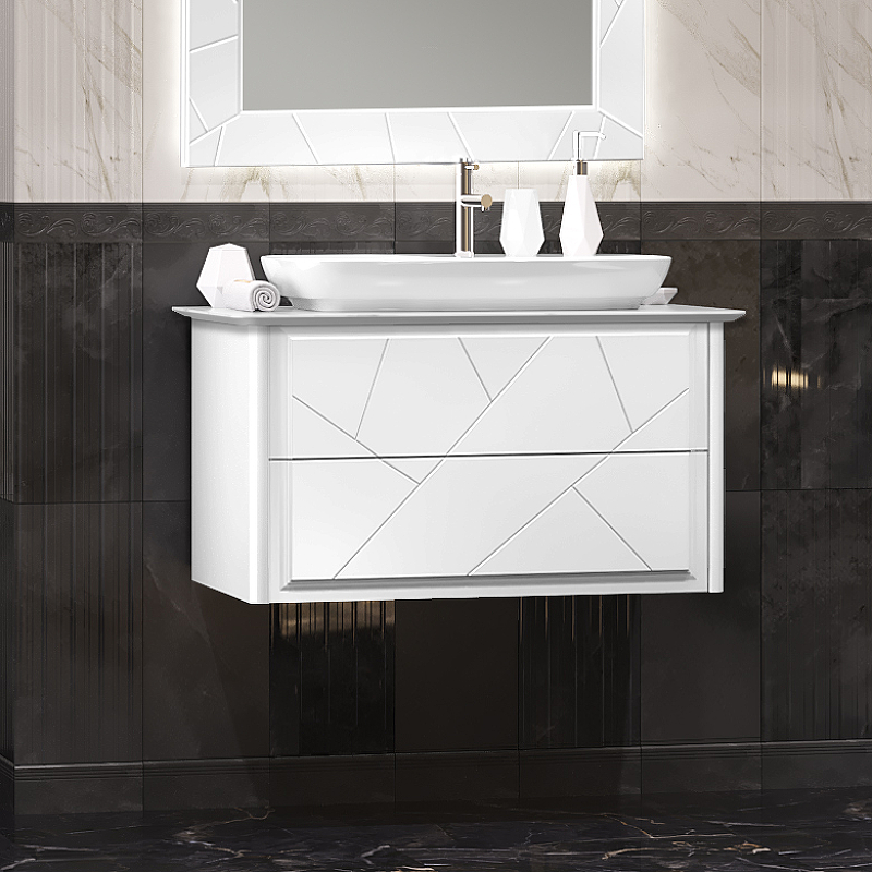 Коллекцию ЛУИДЖИ украшают сложная фрезеровка фасадов строгими линиями и декоративная подсветка по периметру зеркала, которое оснащено сенсорным выключателем. Тумбы дополняются современными ультратонкими керамическими слим-раковинами в размерах 70 см и 90 см.