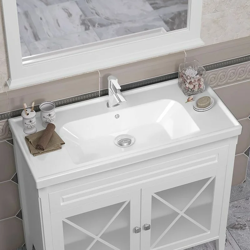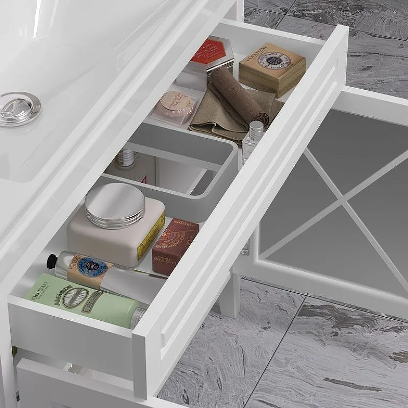 Мебель оснащена глубокими керамическими раковинами и механизмами плавного закрывания Hettich (Германия).