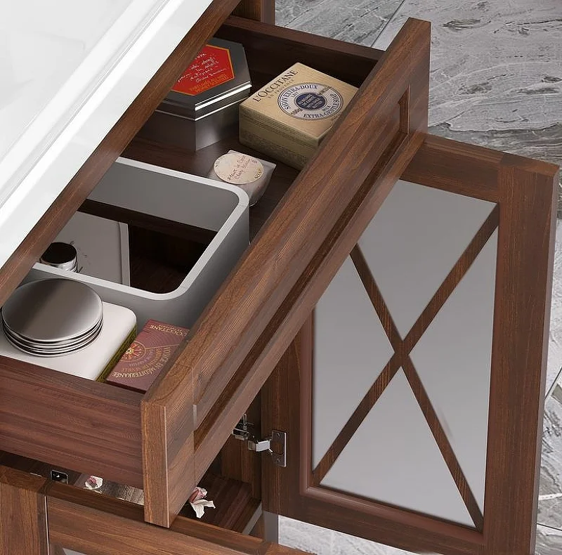Мебель оснащена глубокими керамическими раковинами и механизмами плавного закрывания Hettich (Германия).