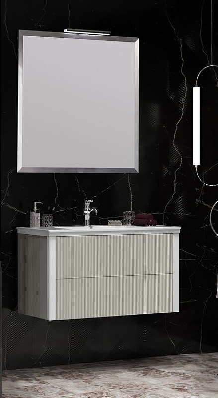Зеркальное полотно с широким фацетом подчеркивает строгие формы коллекции, а светодиодный светильник над зеркалом освещает рабочее пространство.
