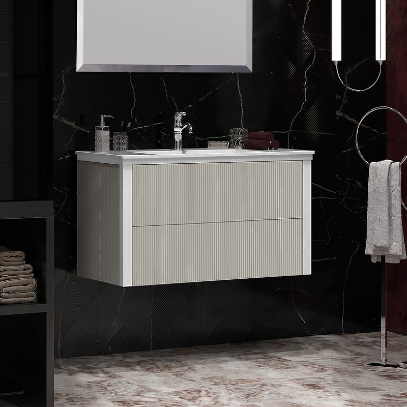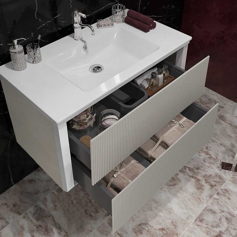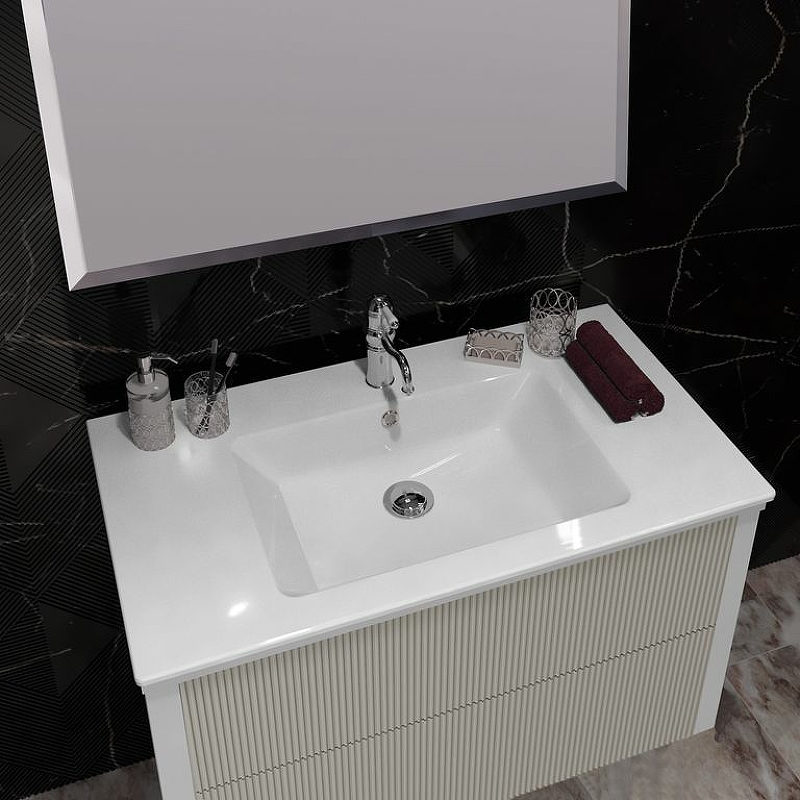 Мебель укомплектована ультратонкой керамической раковиной на две чаши, которая даёт возможность встречать каждое утро вдвоем.