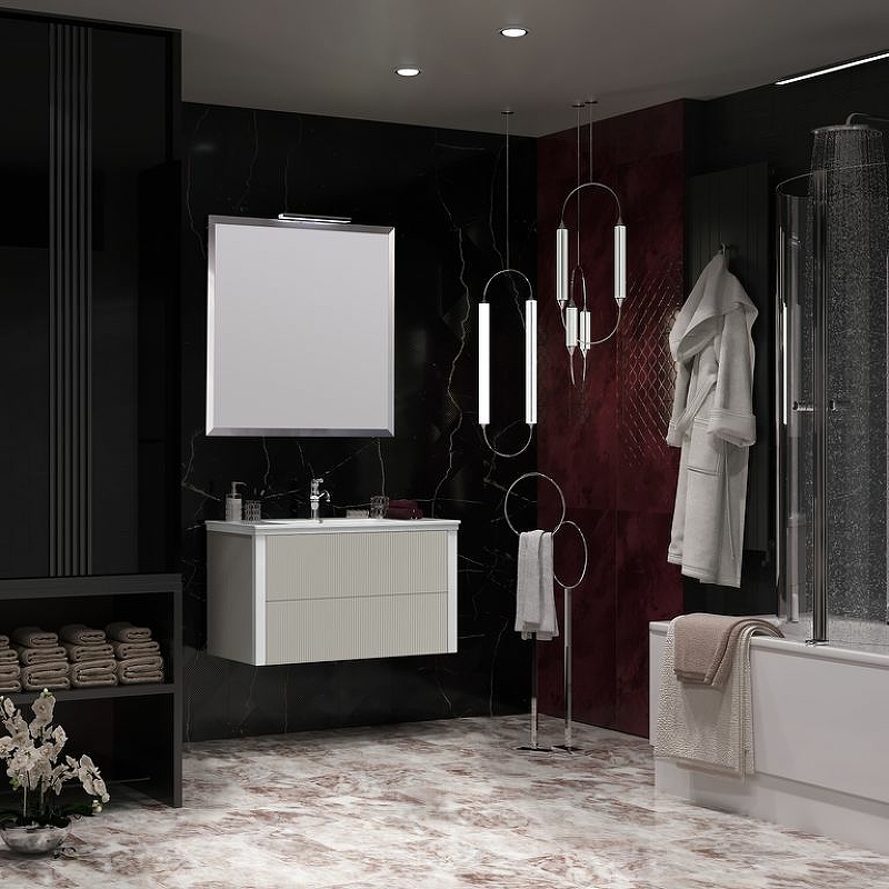 Коллекция РУБИННО исполнена по всем современным требованиям стиля для мебели в ванную комнату 2020 года.