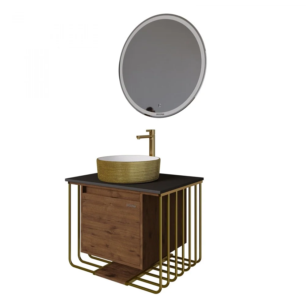 Тумба подвесная Винтаж 70 см решает задачу грамотной и компактной организации хранения вещей, сохранив при этом уютный интерьер. Тумбу обрамляют золотые металлические конструкции,которые служат не только декором, но и являются дополнительным местом для хранения текстиля. Выдвижной ящик вмещает в себя аксессуары и предметы гигиены разных габаритов. Корпус тумбы выполнен из влагостойкого ЛДСП, фасады ящиков - из МДФ в структурной пленке, столешница из МДФ ПВХ черный матовый устойчивых к перепадам температур и высокой влажности, крепится к стене.