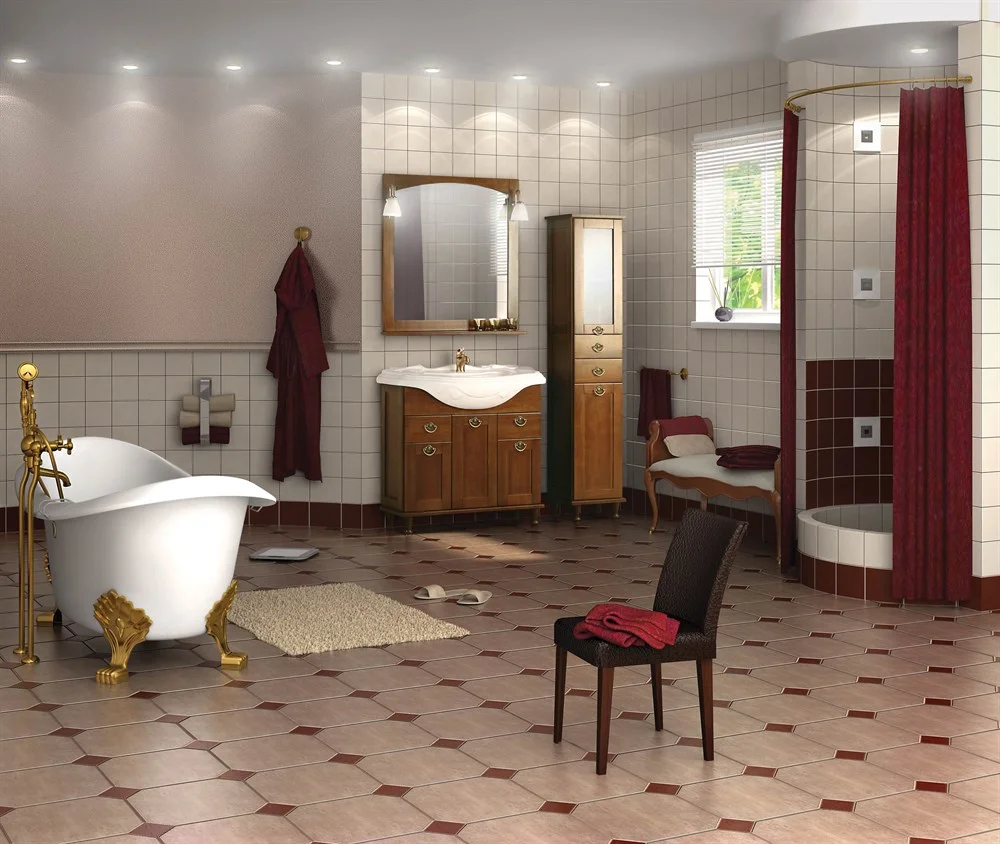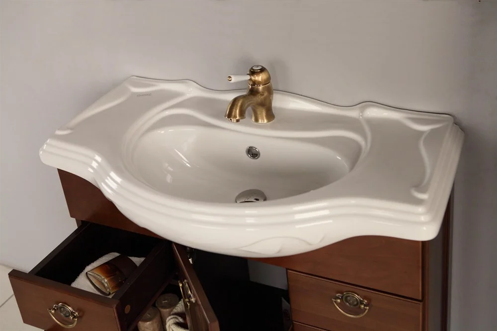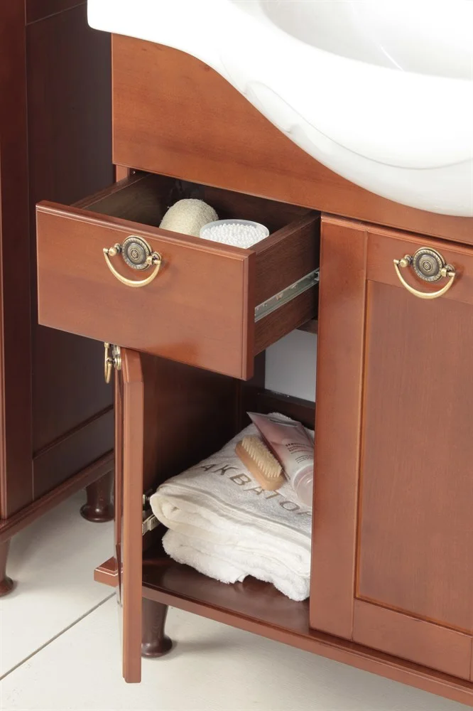 Тумба для раковины America в классическом стиле от испанского бренда Roca, выполненная с элементами массива дерева, укомплектована выдвижными ящиками и распашными дверцами с доводчиками.