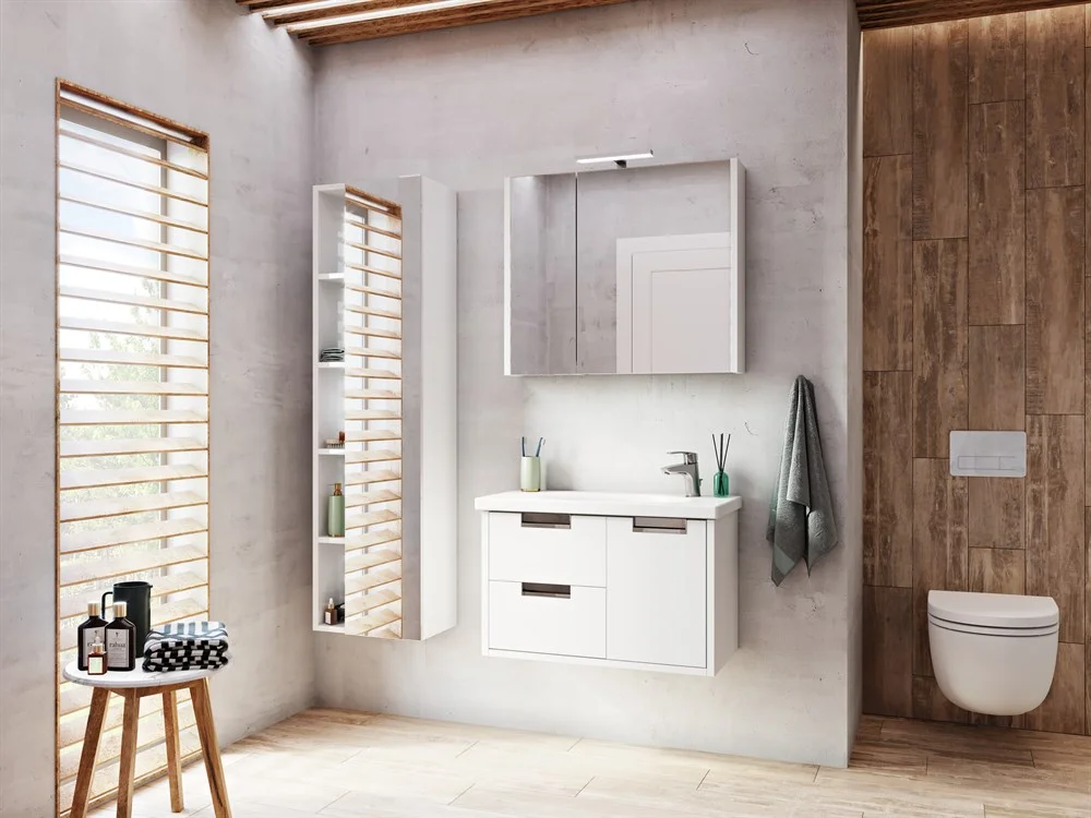 Тумба для раковины Etna в современном стиле от испанского бренда Roca, выполненная из влагостойкой высококачественной ЛДСП и МДФ с ящиками и распашной дверцей с доводчиками.