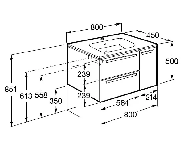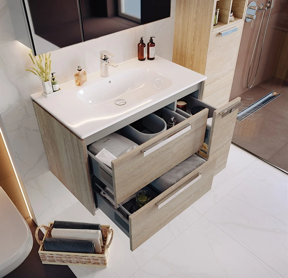 Тумба для раковины Lago в современном стиле от испанского бренда Roca, выполненная из высококачественной влагостойкой ЛДСП в цвете светлый дуб, с ящиками полного выдвижения и бутылочницей.