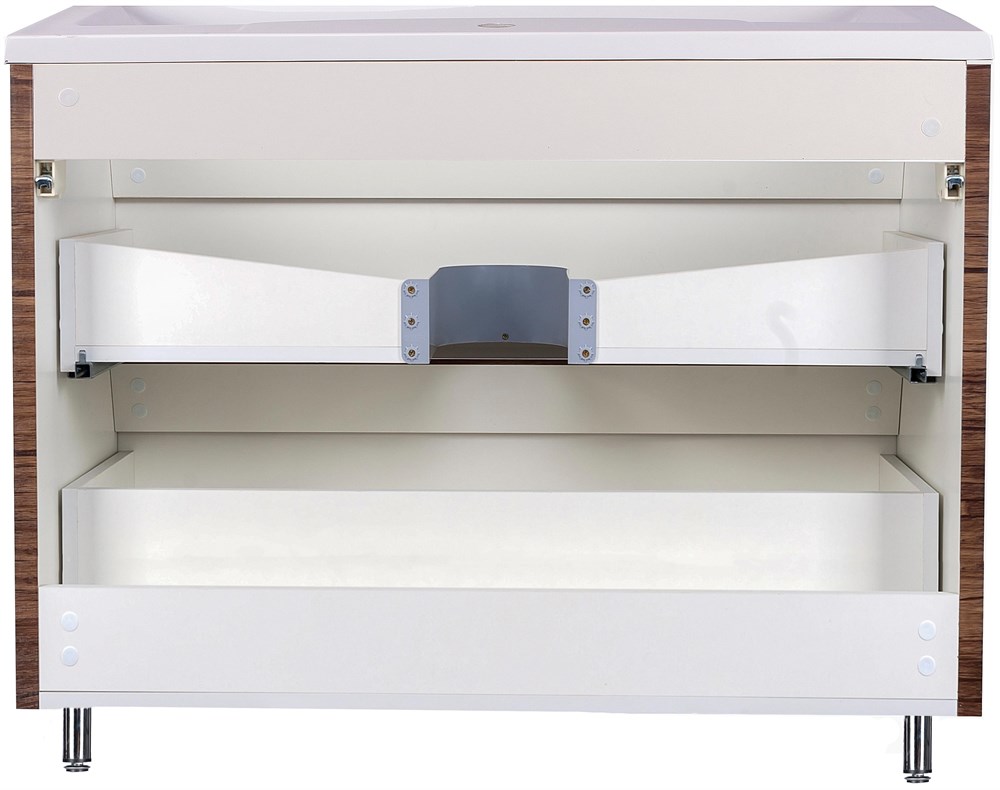 Тумба под раковину Атлантика 90 см от Style Line представлена в отделке состаренного дерева, благодаря чему изделие выглядит солидно и респектабельно. Сглаженные углы корпуса делают модель безопасной в эксплуатации и придают ей элегантности. Несмотря на то, что выдвижные ящики достаточно вместительны они будут легко и плавно выдвигаться даже при условии их полного наполнения, благодаря надежным механизмам доводчиков и прочным креплениям. Контраст глянцевой холодной белизны раковины и темного цвета поверхностей смотрится эффектно и выигрышно.