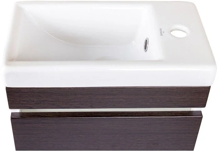 Тумба с раковиной Style Line относится к современной мебели класса люкс. Она изготовлена из экологичной МДФ Kronospan. При производстве используется южнокорейская пленка толщиной 2,8 микрона, при натяжении которой на каждый элемент изделия наносится высококачественный клей Henkel. Поверхность корпуса матовая, фасада – глянцевая. Для отделки применяют кромочный материал Rehau толщиной 4 мм. При сборке мебели используются дюбель-стяжки Hettich, обеспечивающие надежное крепление. Они закрываются немецкими заглушками, которые выполняют барьерную и декоративную функции. Тумба цвета венге дополнена белой фаянсовой раковиной. Такое сочетание цветов вызывает эффектный контраст. Для монтажа изделия применяются усиленные хромированные скрытые навесы Camar.