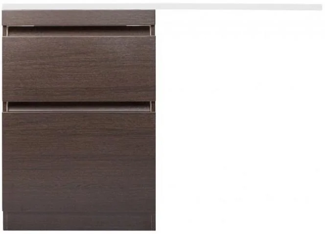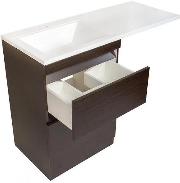 Тумба с раковиной Даллас представлена в цвете венге и обладает стильным современным дизайном. Белизна глубокой прямоугольной раковины и темный оттенок поверхностей изделия создают эффектный контраст и выигрышно смотрятся в интерьере. В проем под верхней горизонтальной панелью можно поместить стиральную машину либо использовать его для других целей. Но, в любом случае, такое решение помогает сэкономить и организовать пространство. Качественные материалы, надежная фурнитура и практичная конструкция являются главными достоинствами модели.