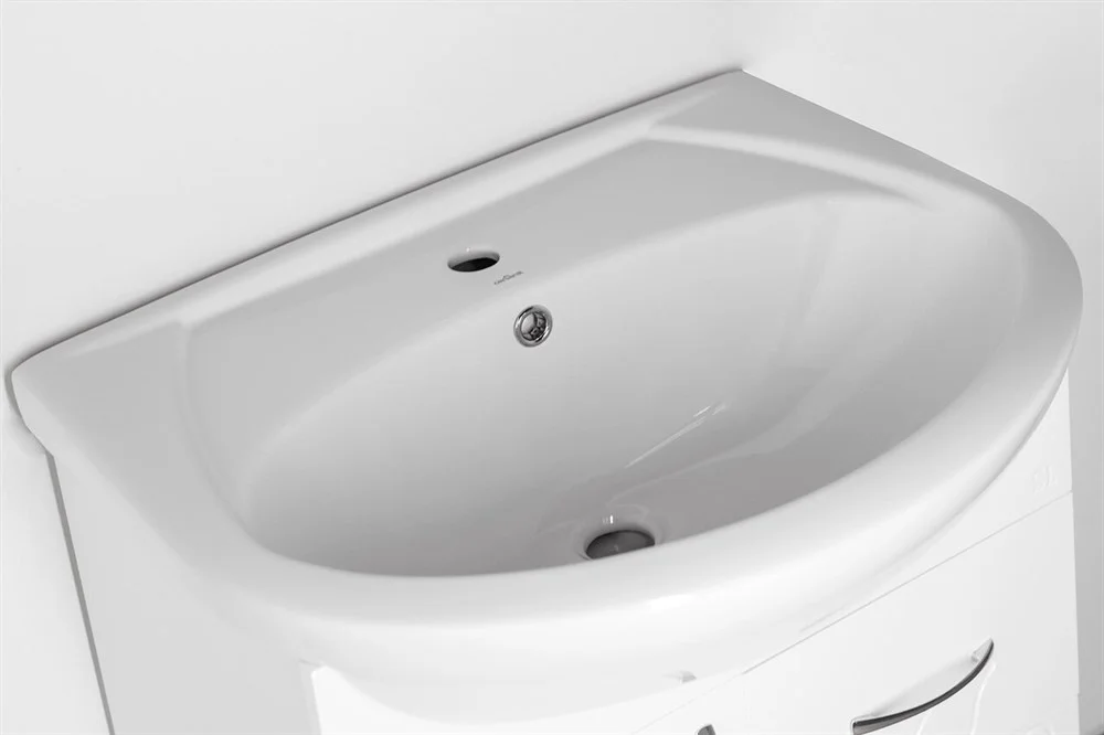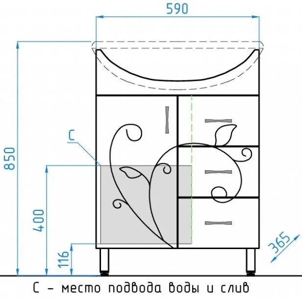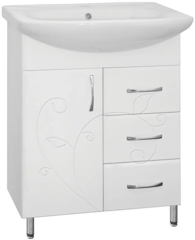 Тумба напольная бренда "Style Line" Эко Фьюжн 24 с 3 ящиками. Фурнитура - хром, тонкая элегантная декоративная фрезеровка фасадов. Направляющие полного выдвижения Hettich; эксклюзивный декор "Луино" - ламинация внутренней стороны изделия; сборка изделия с помощью эксцентриковых стяжек Hafele; все материалы полностью влагостойкие. Данная тумба предусматривает открытую подводку воды