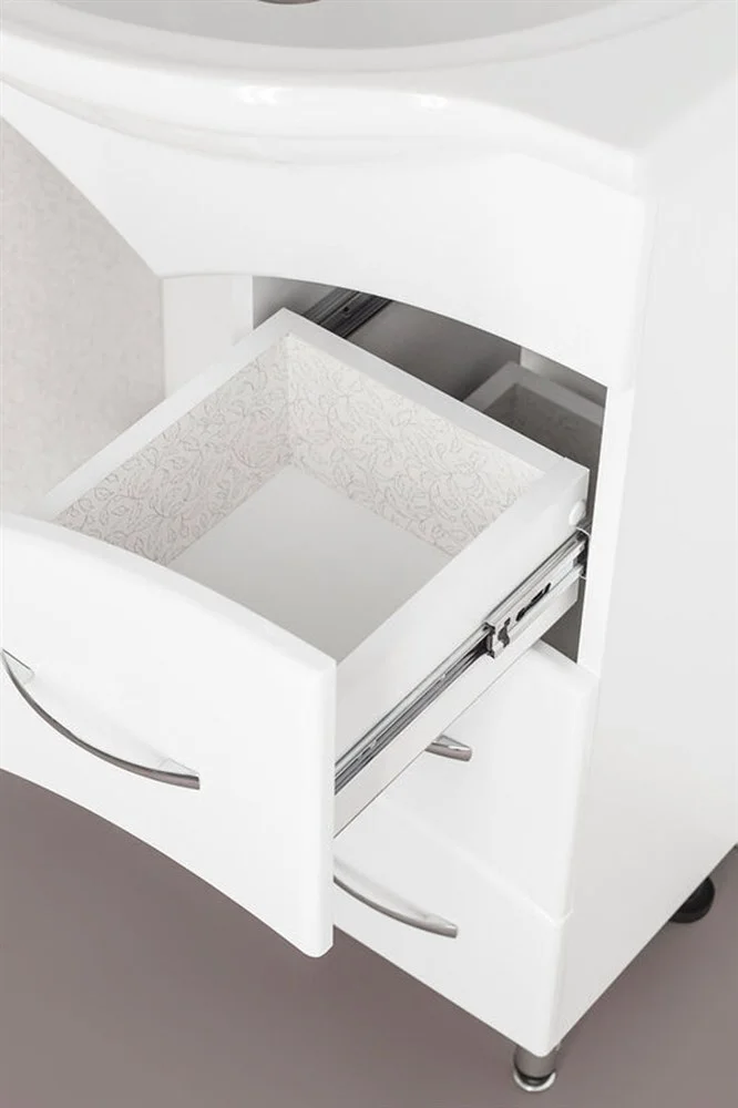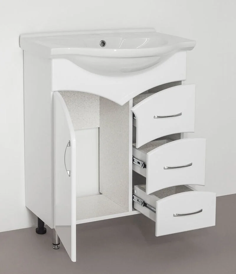 Тумба напольная бренда "Style Line" Эко Стандарт 22 с 3 ящиками. Фурнитура - хром, эксклюзивный декор "Луино" - ламинация внутренней стороны изделия. Направляющие полного выдвижения Hettich; сборка изделия с помощью эксцентриковых стяжек Hafele; все материалы полностью влагостойкие. Данная тумба предусматривает открытую подводку воды