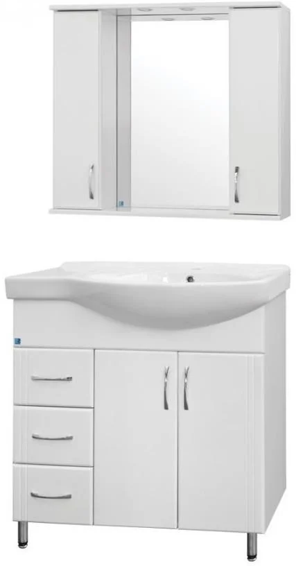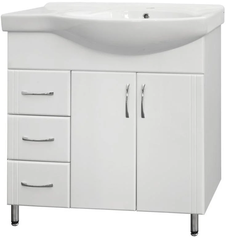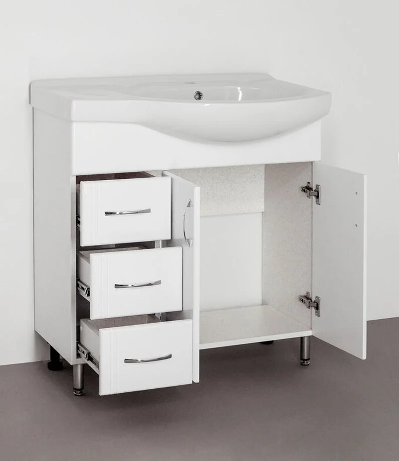 Тумба напольная бренда "Style Line" Эко Стандарт 25 с 3 ящиками. Фурнитура - хром, эксклюзивный декор "Луино" - ламинация внутренней стороны изделия. Направляющие полного выдвижения Hettich; сборка изделия с помощью эксцентриковых стяжек Hafele; все материалы полностью влагостойкие. Данная тумба предусматривает открытую подводку воды