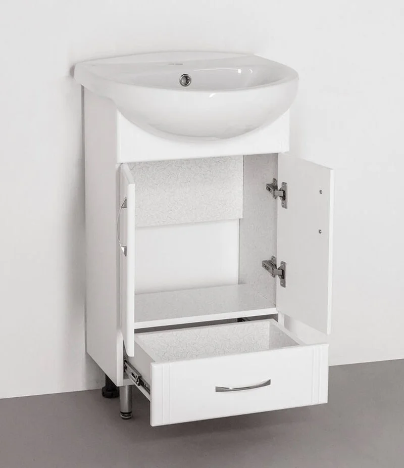 Тумба напольная бренда "Style Line" Эко Стандарт 9/1 Б. Фурнитура - хром, эксклюзивный декор "Луино" - ламинация внутренней стороны изделия. Направляющие полного выдвижения Hettich; сборка изделия с помощью эксцентриковых стяжек Hafele; все материалы полностью влагостойкие. Данная тумба предусматривает открытую подводку воды