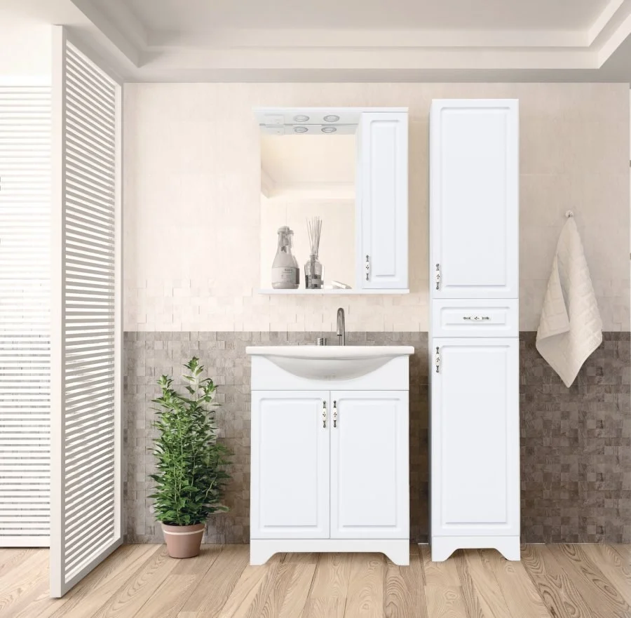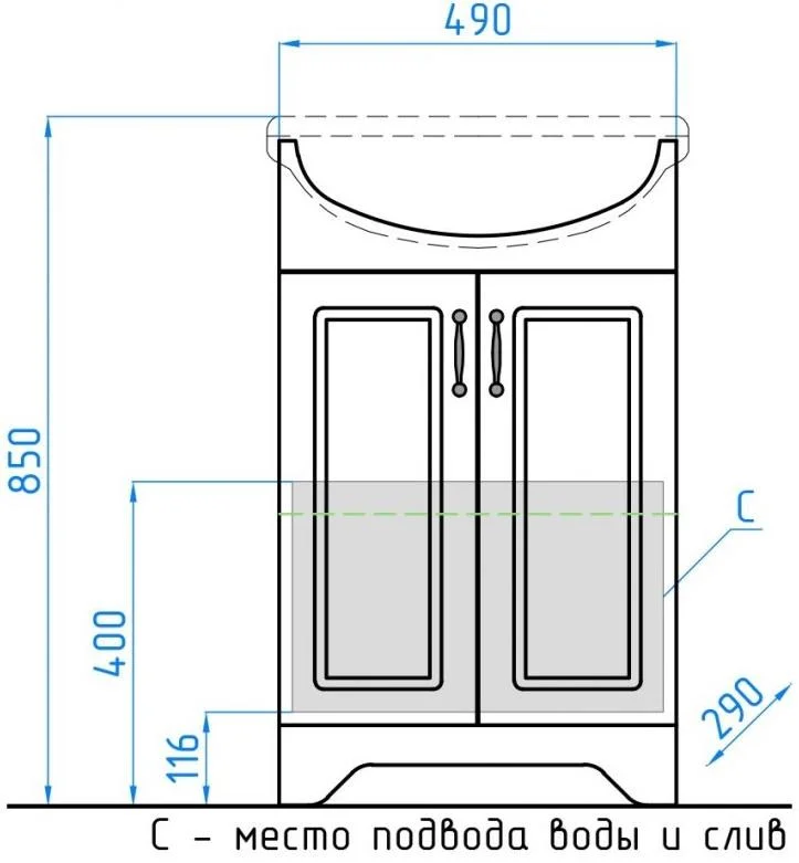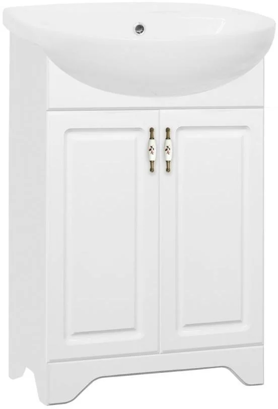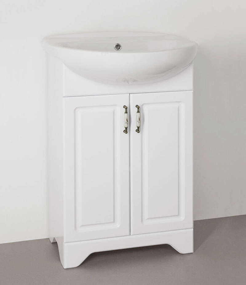 Тумба напольная бренда "Style Line" коллекции "Олеандр-2" классического дизайна, декорированная ручками с керамическими вставками "под бронзу" с изящным рисунком. Направляющие полного выдвижения Hettich; сборка изделия с помощью эксцентриковых стяжек Hafele; все материалы полностью влагостойкие. Данная тумба предусматривает открытую подводку воды