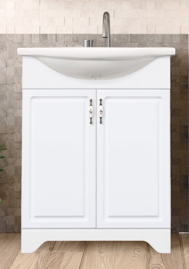 Тумба напольная бренда "Style Line" коллекции "Олеандр-2" классического дизайна, декорированная ручками с керамическими вставками "под бронзу" с изящным рисунком. Направляющие полного выдвижения Hettich; сборка изделия с помощью эксцентриковых стяжек Hafele; все материалы полностью влагостойкие. Данная тумба предусматривает открытую подводку воды