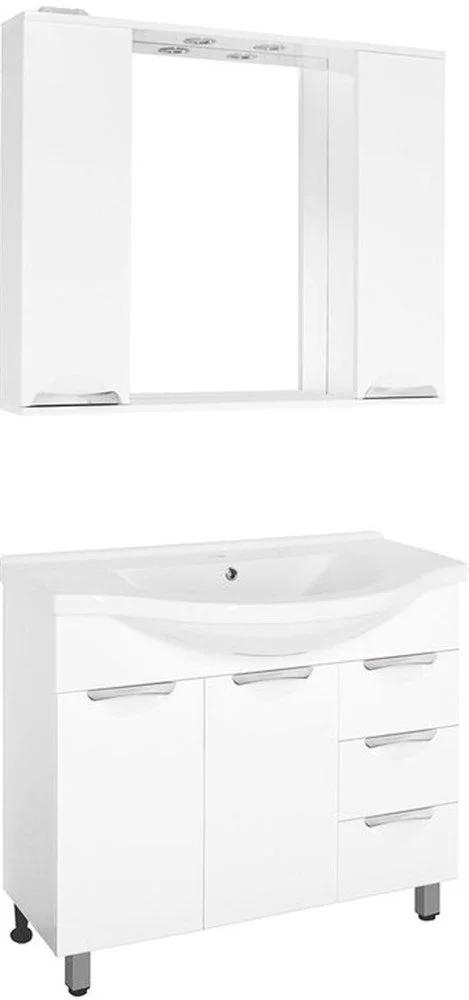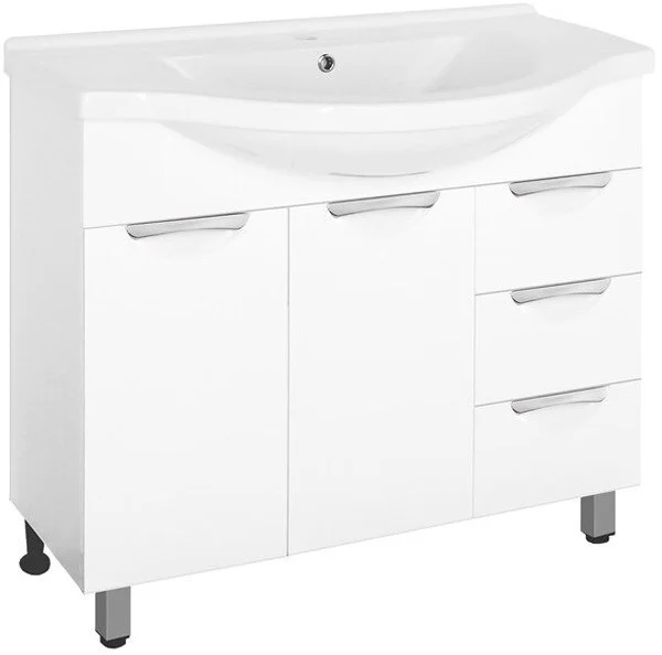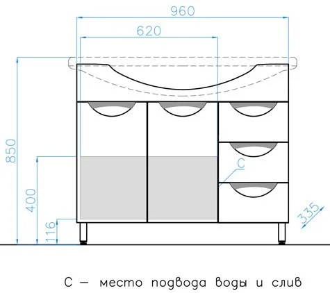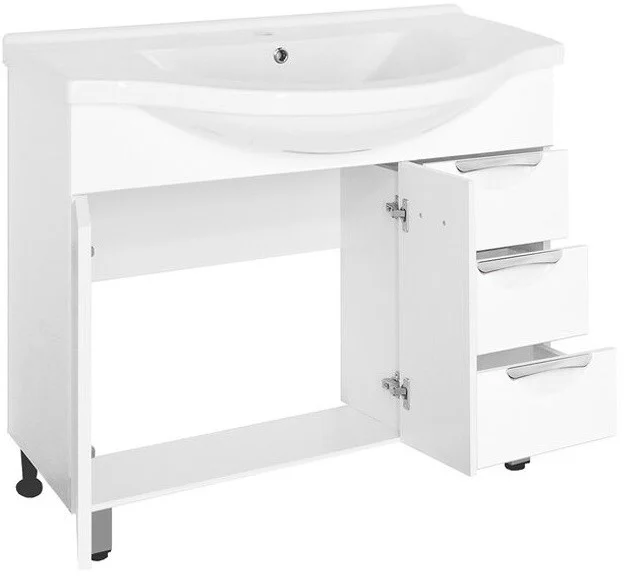 Тумба напольная бренда "Style Line" коллекции "Жасмин" со стильными врезными ручками. Фурнитура - хром, направляющие полного выдвижения Hettich; сборка изделия с помощью эксцентриковых стяжек Hafele; все материалы полностью влагостойкие. Данная тумба предусматривает открытую подводку воды