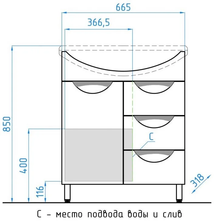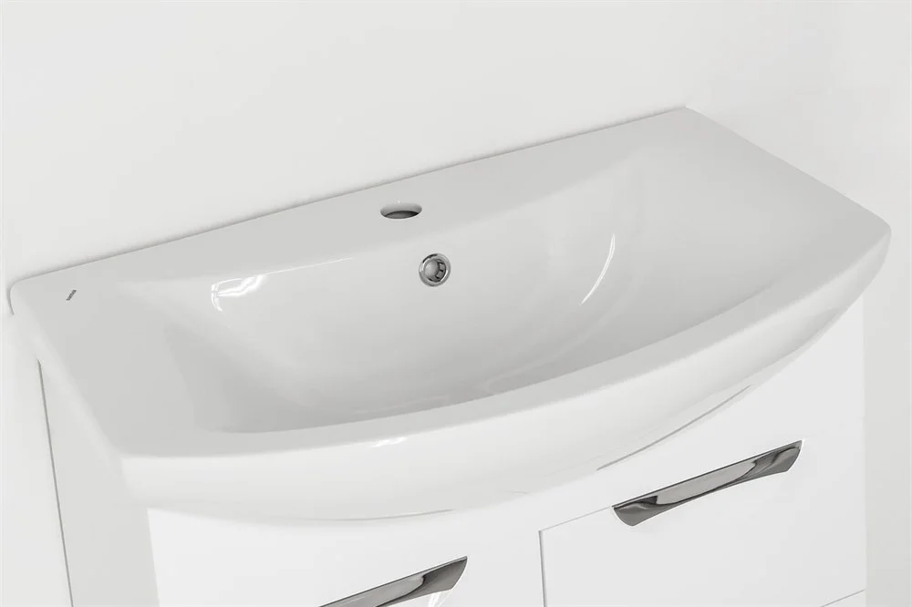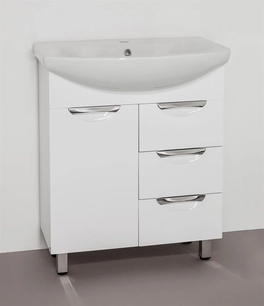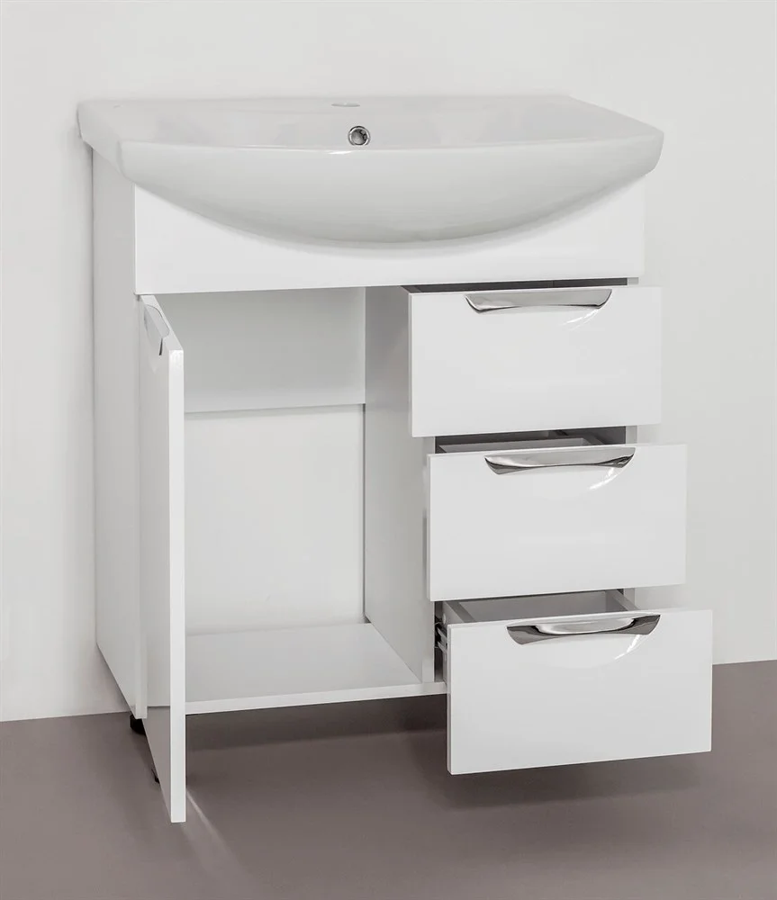 Тумба напольная бренда "Style Line" коллекции "Жасмин" со стильными врезными ручками. Фурнитура - хром, направляющие полного выдвижения Hettich; сборка изделия с помощью эксцентриковых стяжек Hafele; все материалы полностью влагостойкие. Данная тумба предусматривает открытую подводку воды