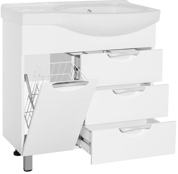 Тумба с бельевой корзиной бренда "Style Line" коллекции "Жасмин" со стильными врезными ручками. Фурнитура - хром, направляющие полного выдвижения Hettich; сборка изделия с помощью эксцентриковых стяжек Hafele; все материалы полностью влагостойкие