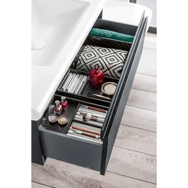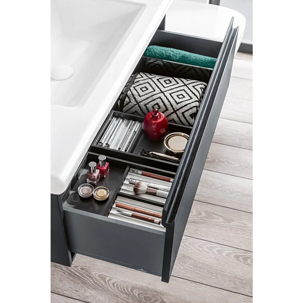 В мебели для ванной с полным выдвижением выдвижные ящики можно полностью выдвигать, благодаря этому хорошо видно все их содержимое. Вы получаете в ванной комнате превосходный обзор, и благодаря полному выдвижению все принадлежности находятся у вас под рукой.