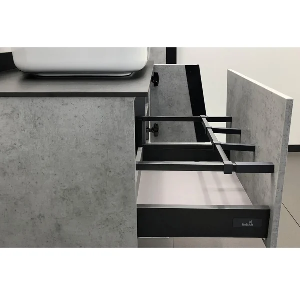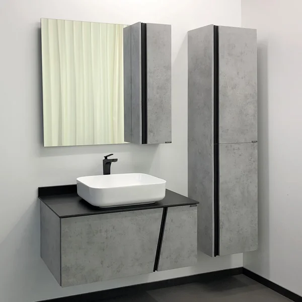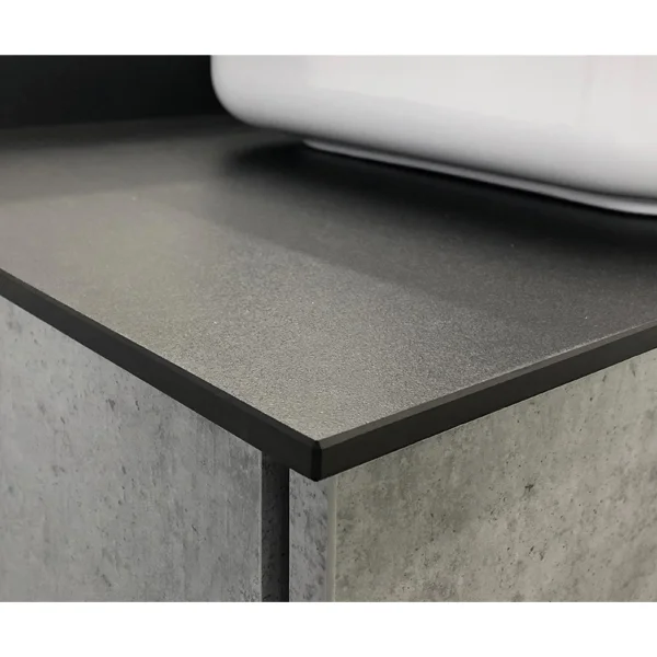 Тумба укомплектована столешницей и плинтусом из черного керамогранита и накладной прямоугольной раковиной Comforty T-Y9378. Корпус и фасады тумбы изготовлена из влагостойкого ДСП цвета "Бетон светлый". Тумба подготовлена для подключения водоснабжения снизу.