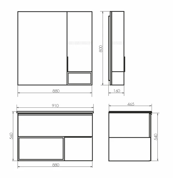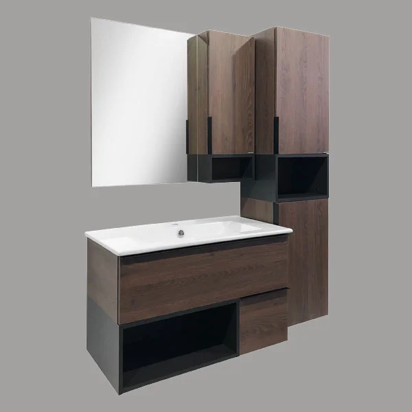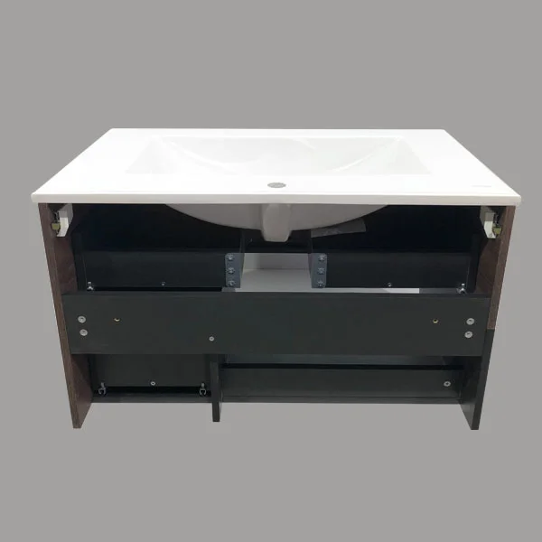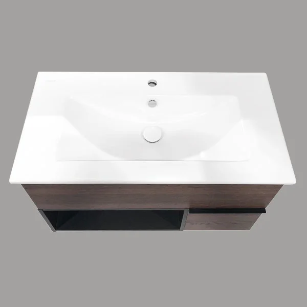 Тумба-умывальник в современном стиле с двумя выкатными ящиками и пространством для открытого хранения. Ящики оснащены системой с плавным закрыванием. Тумба укомплектована черными матовыми алюминиевыми ручками и накладной прямоугольной раковиной из санфарфора.
