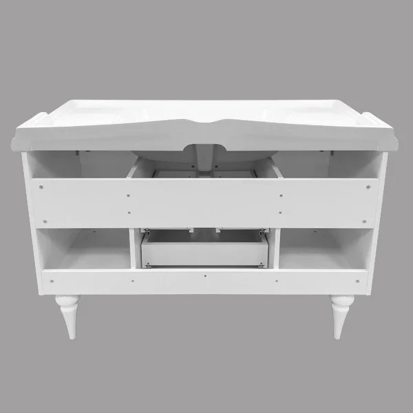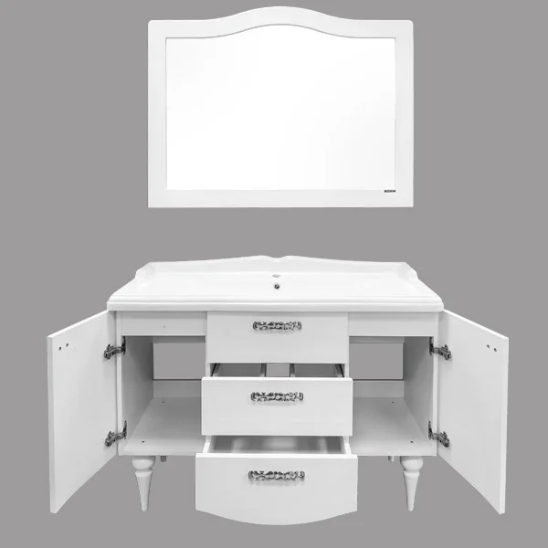 Тумба-умывальник в неоклассическом стиле с двумя створками и двумя выдвижными ящиками. Створки оснащены петлями с плавным закрыванием. Фасады тумбы покрыты белой глянцевой эмалью. Тумба укомплектована широкой и глубокой раковиной в классическом стиле с бортиком по периметру.