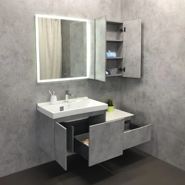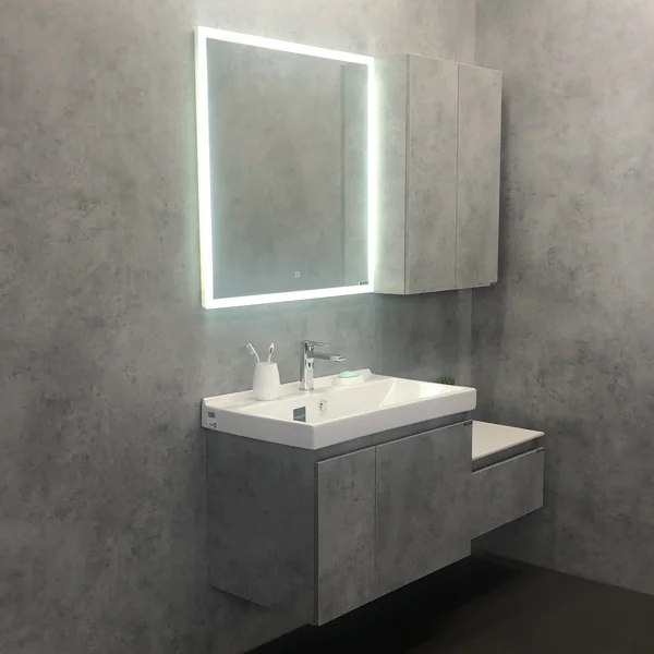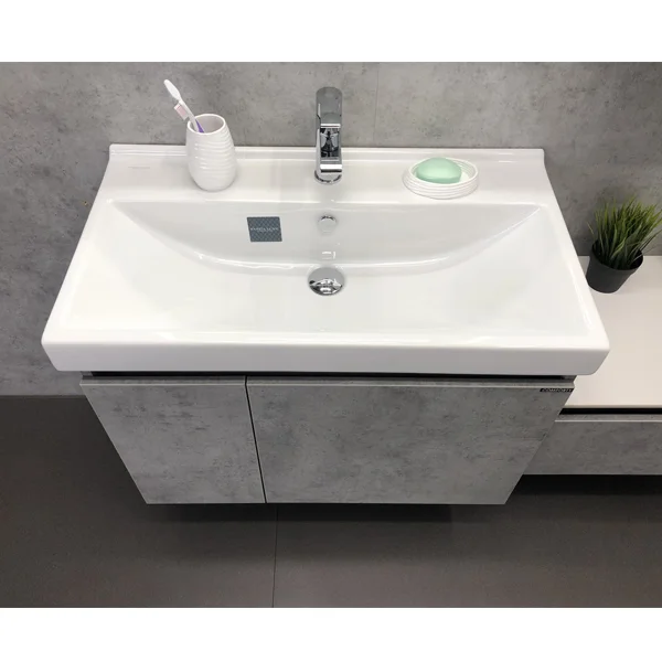 Подвесная тумба-умывальник шириной 80 см с распашной дверцей и глубоким выдвижным ящиком для хранения принадлежностей для умывания и бытовой химии. Петли створки и направляющие ящика оснащены механизмами плавного закрывания. Фасады и корпус из влагостойкого ЛДСП цвета бетон светлый.