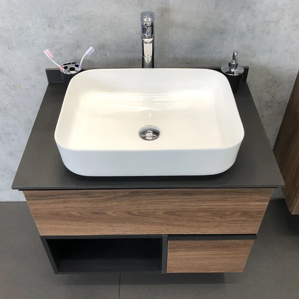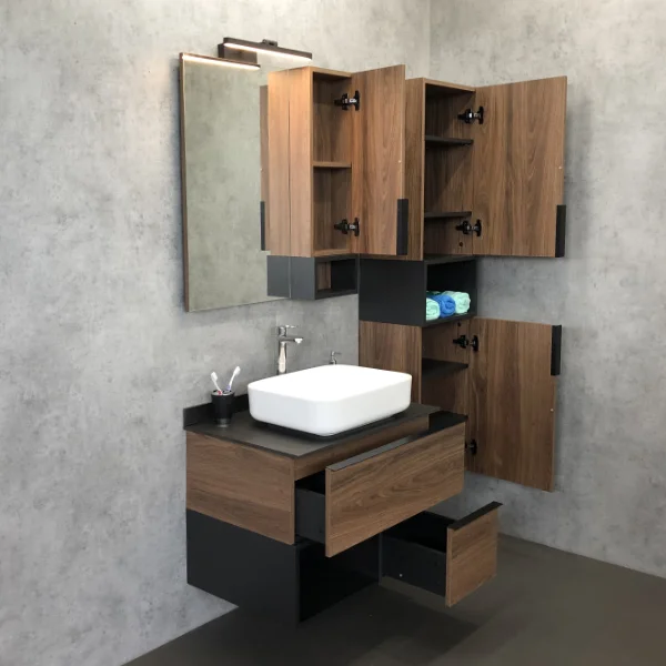Тумба-умывальник в современном стиле с двумя выкатными ящиками и пространством для открытого хранения. Ящики оснащены системой с плавным закрыванием. Тумба укомплектована черными матовыми алюминиевыми ручками и столешницей, плинтусом из керамогранита и накладной прямоугольной раковиной из санфарфора.