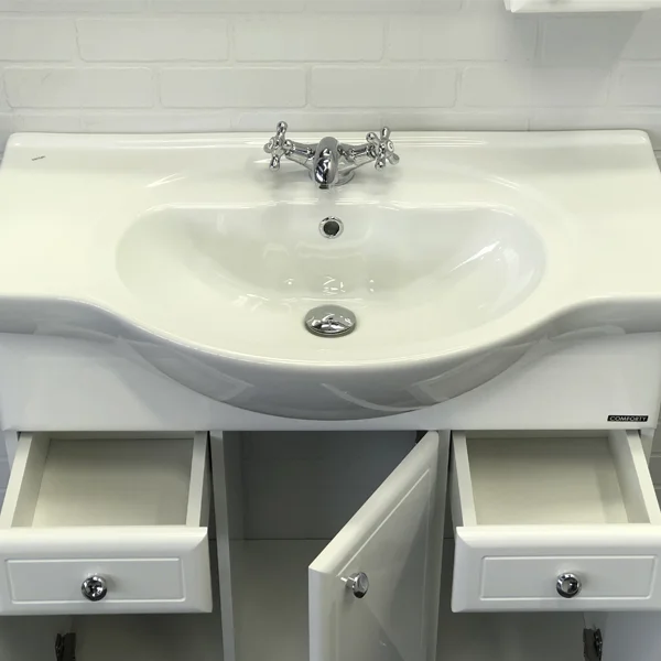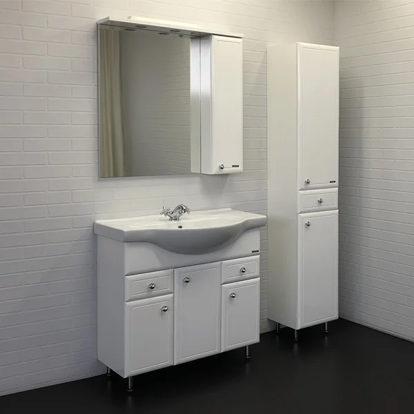 Тумба-умывальник в классическом стиле с тремя створками и двумя выдвижными ящиками. Створки оснащены петлями с плавным закрыванием. Фасады и боковины тумбы покрыты белой глянцевой эмалью. Тумба укомплектована широкой и глубокой раковиной Сантек Сенеж 87