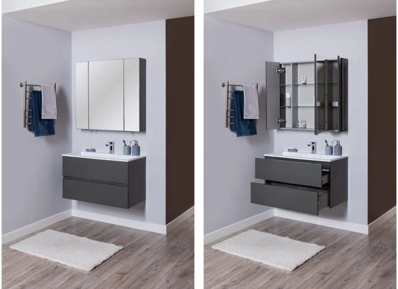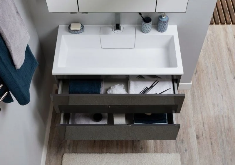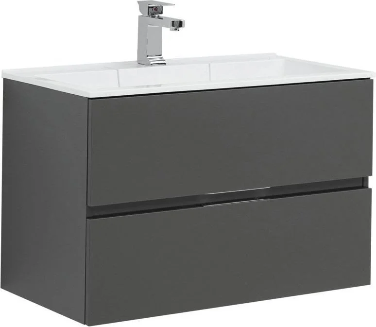 Тумба с раковиной Акванет Алвита в цвете "серый антрацит" шириной 80 см придаст интерьеру ванной комнаты нотку особого очарования и уникальности, благодаря своей нестандартной красивой отделке. Покрытие имеет высокие эксплуатационные характеристики, в частности, влагонепроницаемость, прочность и простоту в уходе. Современный дизайн демонстрирует аккуратный минимализм геометрически четких форм, где основная идея подчинена максимальной функциональности. Вместительная тумба с верхним и нижним выдвижными ящиками создает дополнительное пространство, где будут надежно скрыты от влаги банные принадлежности. Ящики тумбы закрываются легко и бесшумно, благодаря механизму доводчика. Тумба комплектуется раковиной из литьевого мрамора «Фортуна», которая имеет уникальную конструкцию слива: вместо привычного расположения по центру, он находится в скрытом отсеке под съемной крышкой. Смещение слива и сифона к стене, в сторону канализационного отвода, избавляет от необходимости менять устройство верхнего ящика тумбы и делать в
