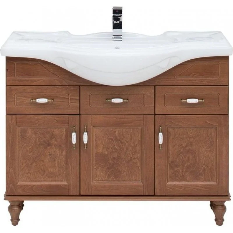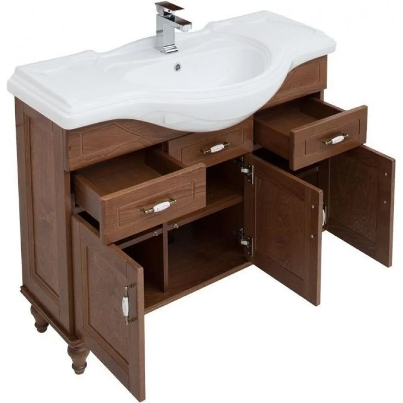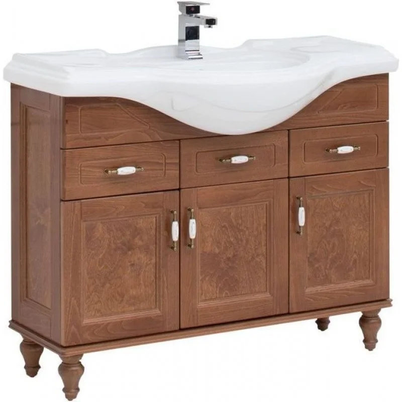 Тумба с раковиной Aquanet «Амелия» S 105 в цвете «орех» выполнена из массива бука. Это обновленная модель коллекции, укомплектованная раковиной-столешницей Yatao. Теплый цвет и текстура натурального дерева воплощают мягкое очарование старины, придают гарнитуру дух аристократизма загородного дома. Нижняя часть тумбы украшена резными деталями, филенчатые дверцы повторяют орнамент рамочных боковин. В тумбе шириной 105 см предусмотрено 6 вместительных полок и 2 выдвижных ящика, которые позволят разместить все необходимые банные принадлежности. Распашные дверцы и фасады ящиков украшены оригинальными ручками в стиле «винтаж».