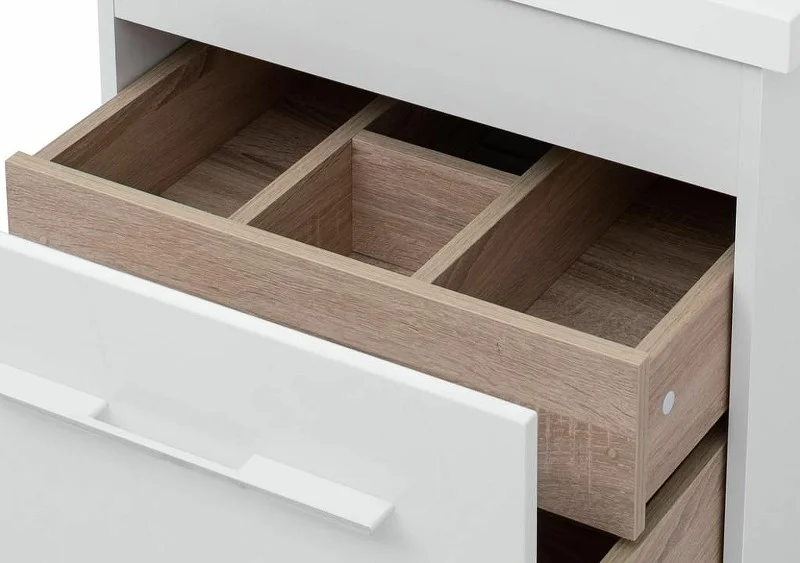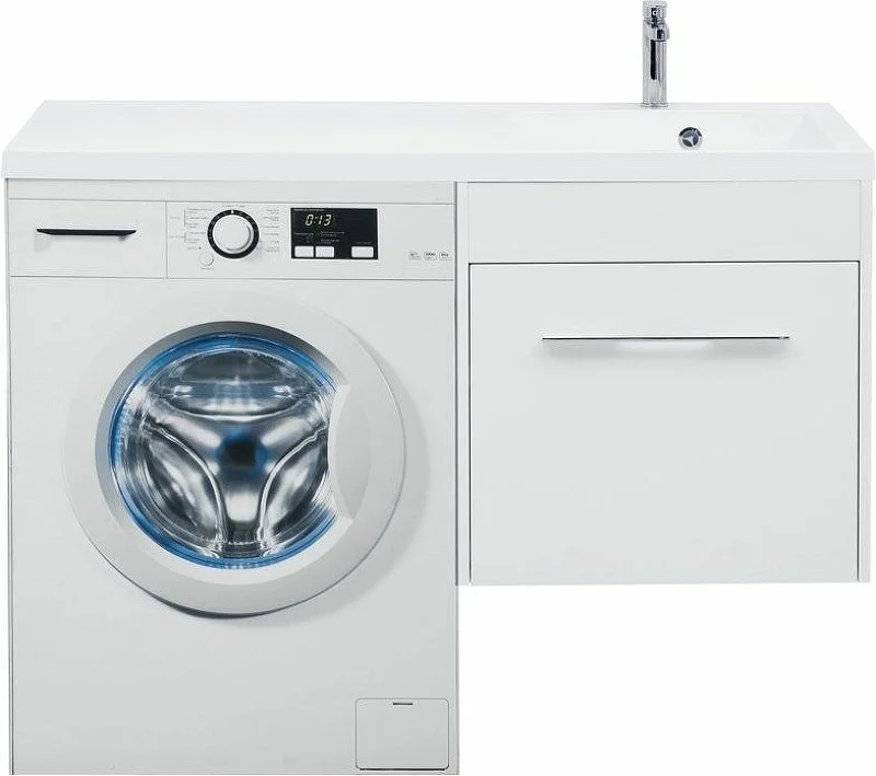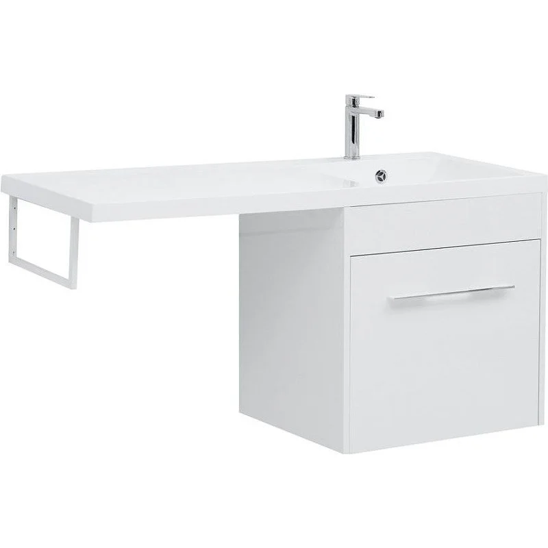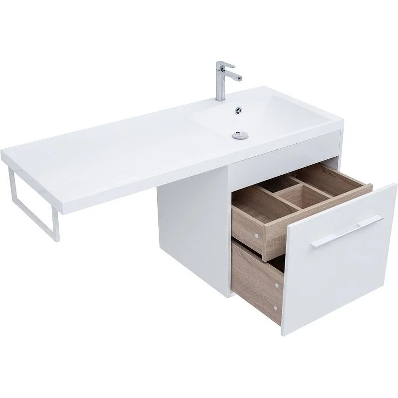 Подвесная тумба "Августа" в белом цвете придется по вкусу любителям эко-стиля, где природные тона, натуральные цвета выходят на первый план. Корпус и фасады тумбы выполнены из ламинированного влагостойкого ДСП. У изделия один ящик, но он с секретом. Внутри скрыт еще один, неглубокий, но очень удобный, разделенный на несколько отделений, где удобно хранить разнообразную мелочевку. Механизм открывания снабжен доводчиками. С использованием раковины "Нота" (Aquanet) из литьевого мрамора с длинной площадкой, предназначенной для установки под ней стиральной машины, тумба приобретает новую функциональную нагрузку и практичное значение. В данной модели место для стиральной машины предусмотрено слева.