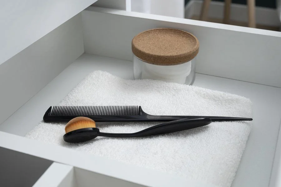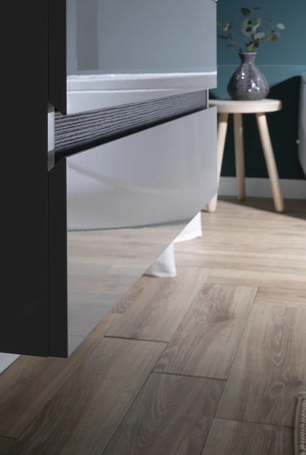 И еще одно важное преимущество: функциональная зона хранения в тумбе шириной 80 см. Она распределена между двумя выдвижными ящиками. Их внутренняя часть выполнена в белом цвете. Верхний ящик – это органайзер, разделенный на три отделения, где удобно хранить мелочи. Нижний более глубокий и позволит сложить полотенца или поставить весь арсенал пеномоющих или гигиенических средств. Ящики оборудованы доводчиками производства германской компании Hettich.