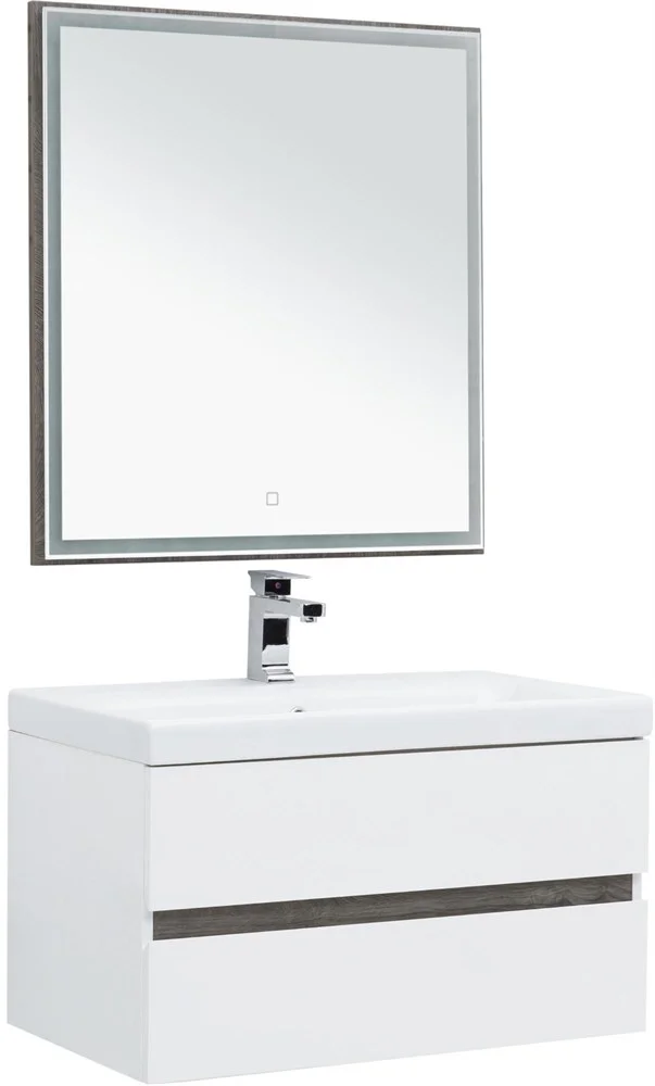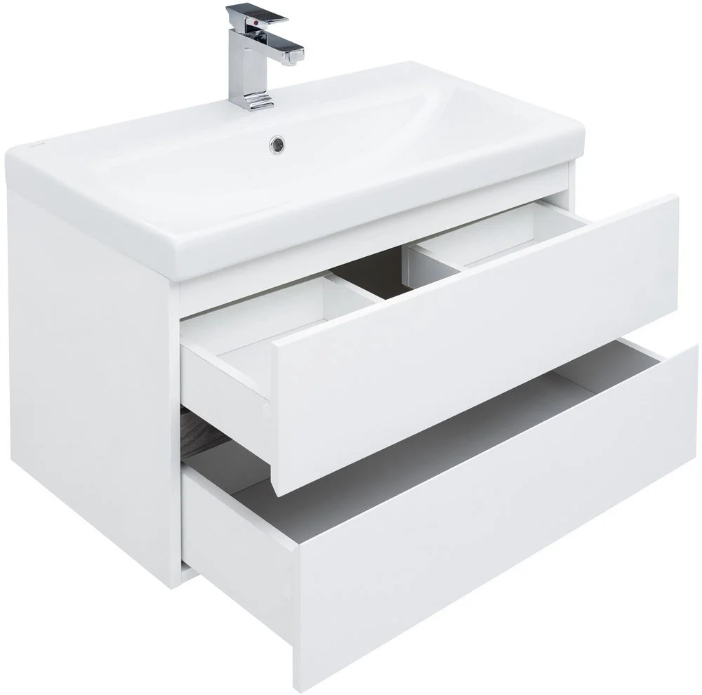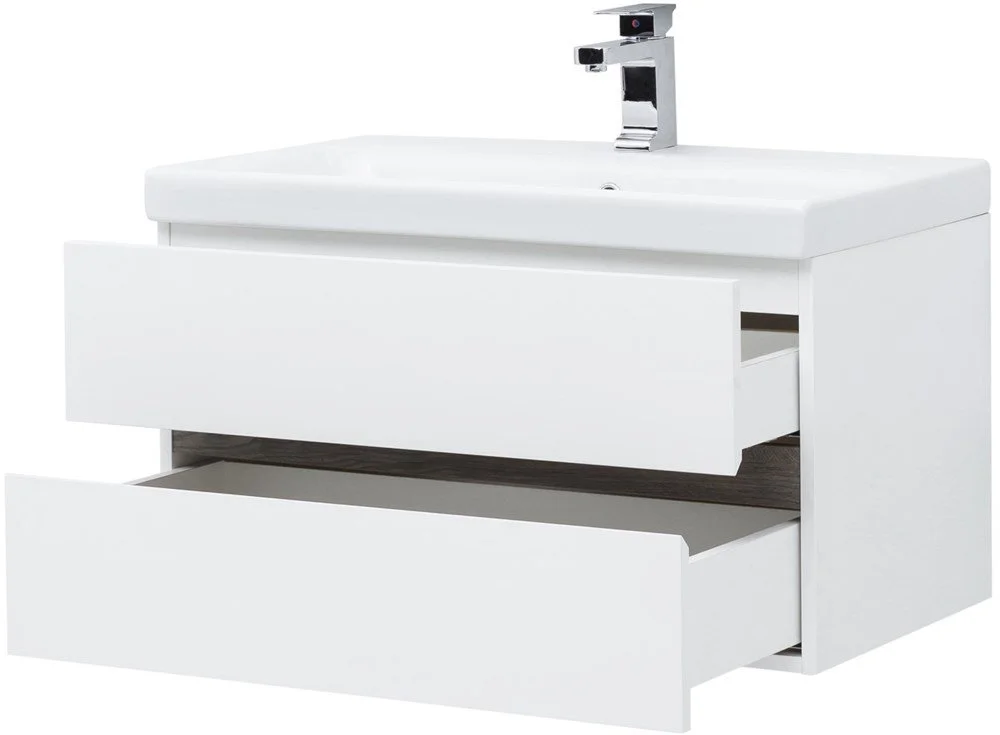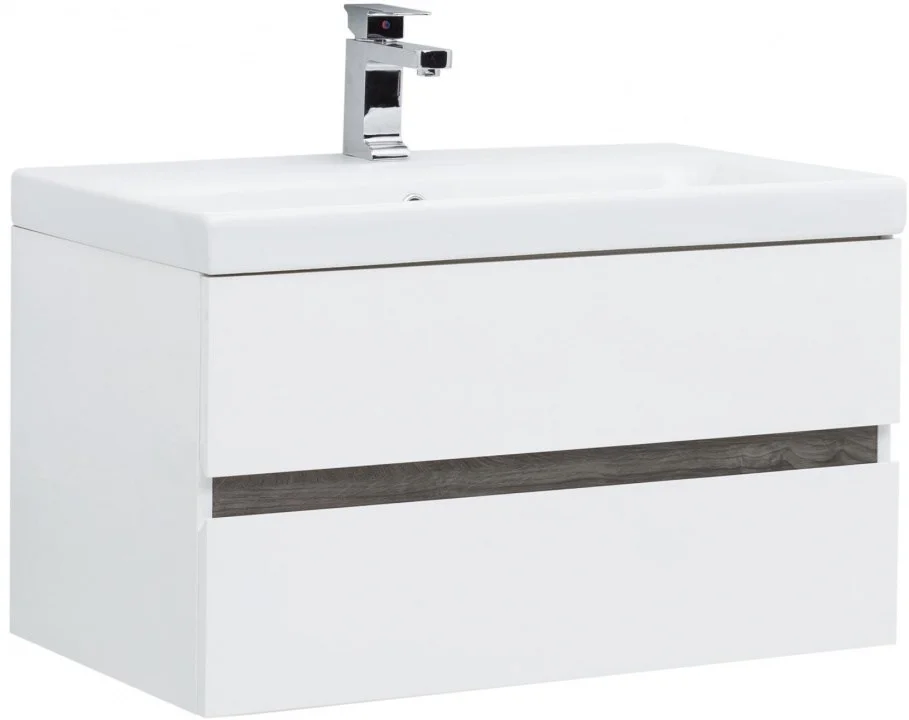 Тумба с раковиной Aquanet Беркли 80 белый/дуб рошелье имеет изюминку - контрастную декоративную полосу между ящиками в цвете «дуб рошелье». Корпус и фасады тумбы выполнены из влагостойкого ЛДСП и покрыты глянцевой белой эмалью. В конструкции тумбы использованы интегрированные ручки без острых краев и внутренних углов.