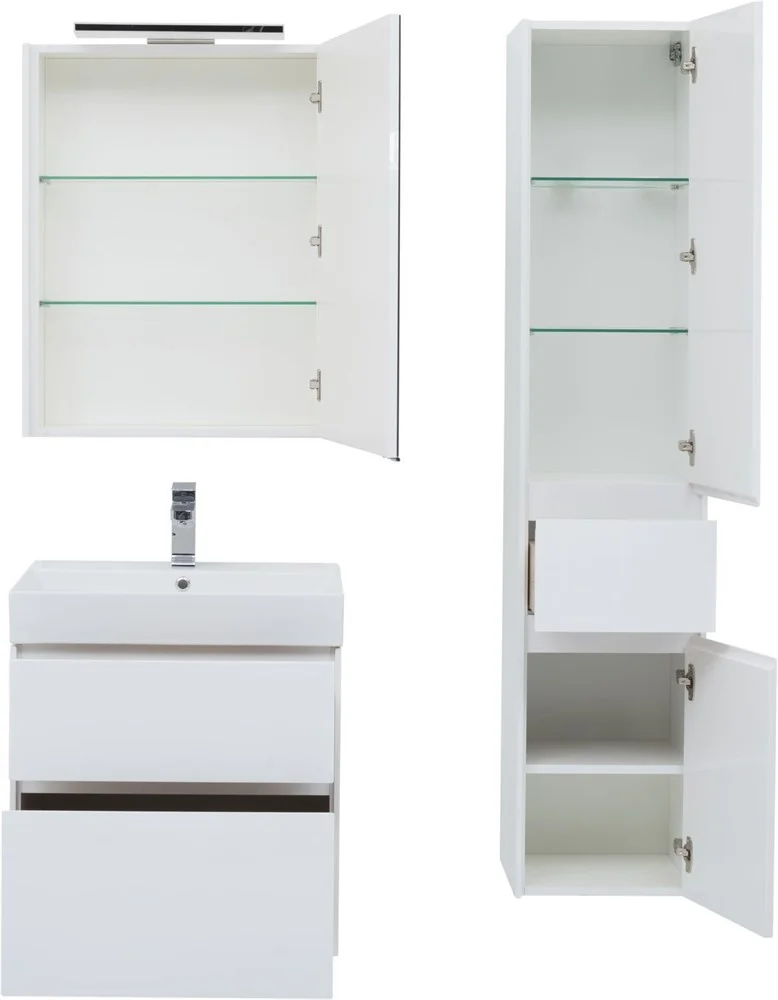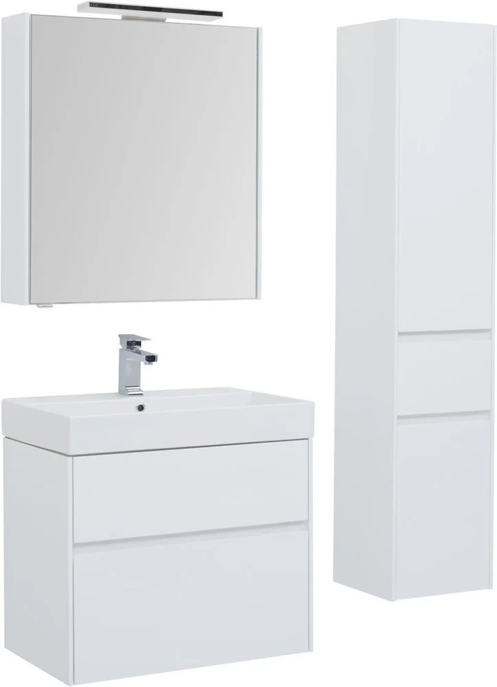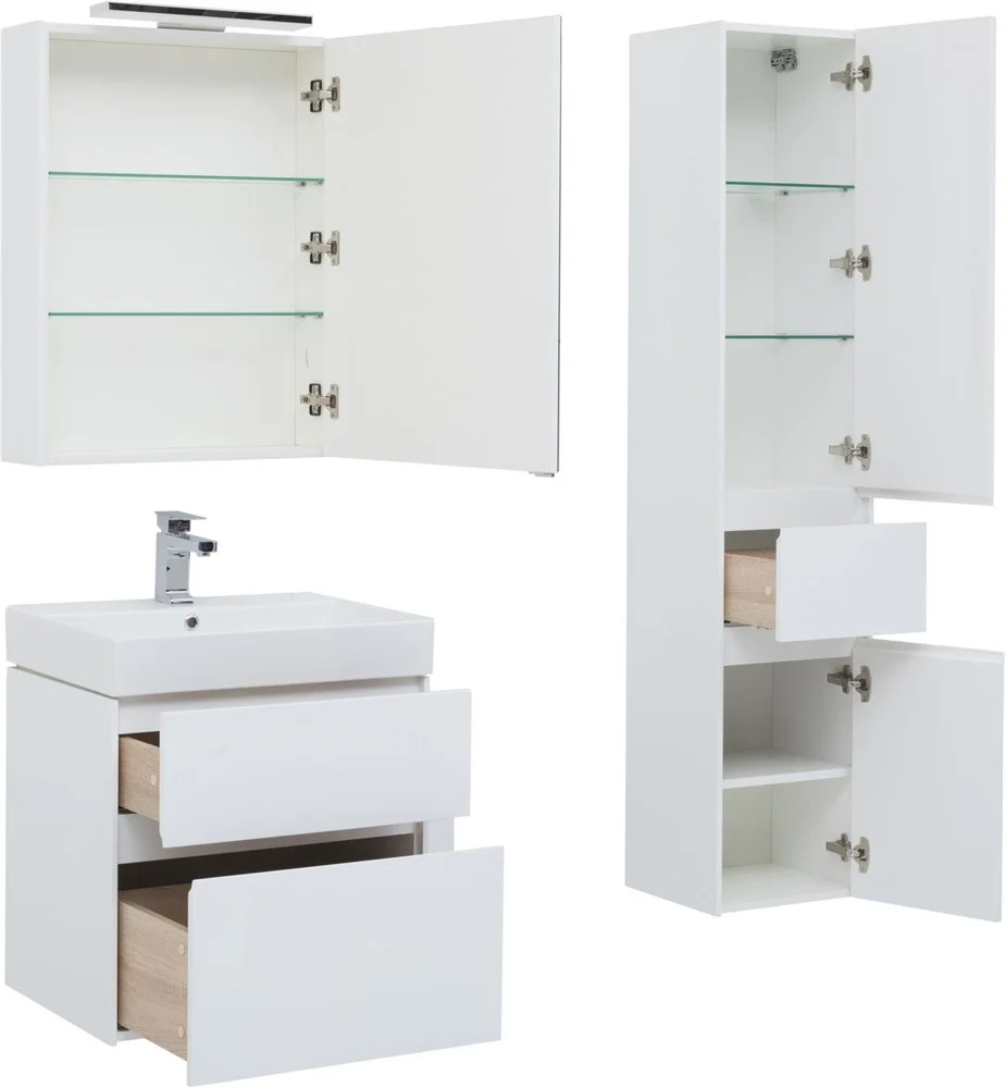 Тумба с раковиной Aquanet Бруклин 70 белого цвета предназначена для подвесной установки Изделие отвечает тенденциям минимализма Аскетизм четких линий и обтекаемых форм в ней доведен до совершенства В модели нет никаких выделяющихся деталей, и даже ручки интегрированные, когда открывание происходит за счет выступающей детали верхней или нижней части фасада, которая срезана под углом, в результате чего образуется выемка, служащая ручкой В тумбе ручка устроена таким образом у верхнего ящика в нижней части фасада, а у нижнего – в верхней Такое простое решение добавляет изысканности внешнему виду изделия Раковина из керамики с тонкими изящными бортиками идет размер в размер с тумбой, ширина которой 70 см, в результате чего все изделие выглядит как единое целое Корпус изделия выполнен из выкрашенного белой краской влагостойкого ЛДСП, фасады – из МДФ На контрасте с белизной внешних деталей стильно смотрится корпус выдвижных ящиков, выполненный в цвете «дуб сонома» Нижний ящик тумбы имеет большую зону хранения, верхн