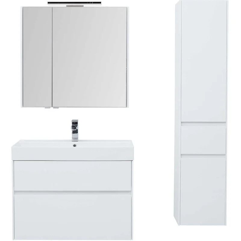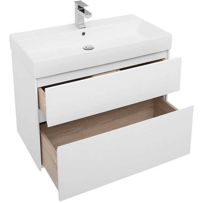 Тумба с раковиной Aquanet Бруклин 85 белого цвета предназначена для подвесной установки Изделие отвечает тенденциям минимализма Аскетизм четких линий и обтекаемых форм в ней доведен до совершенства В модели нет никаких выделяющихся деталей, и даже ручки интегрированные, когда открывание происходит за счет выступающей детали верхней или нижней части фасада, которая срезана под углом, в результате чего образуется выемка, служащая ручкой В тумбе ручка устроена таким образом у верхнего ящика в нижней части фасада, а у нижнего – в верхней Такое простое решение добавляет изысканности внешнему виду изделия Раковина из керамики с тонкими изящными бортиками идет размер в размер с тумбой, ширина которой 85 см, в результате чего все изделие выглядит как единое целое Корпус изделия выполнен из выкрашенного белой краской влагостойкого ЛДСП, фасады – из МДФ На контрасте с белизной внешних деталей стильно смотрится корпус выдвижных ящиков, выполненный в цвете «дуб сонома» Нижний ящик тумбы имеет большую зону хранения, верхн