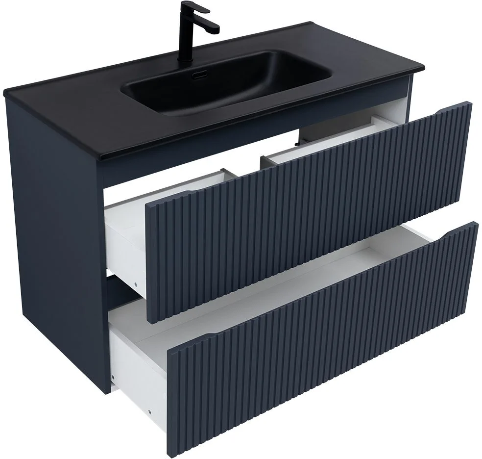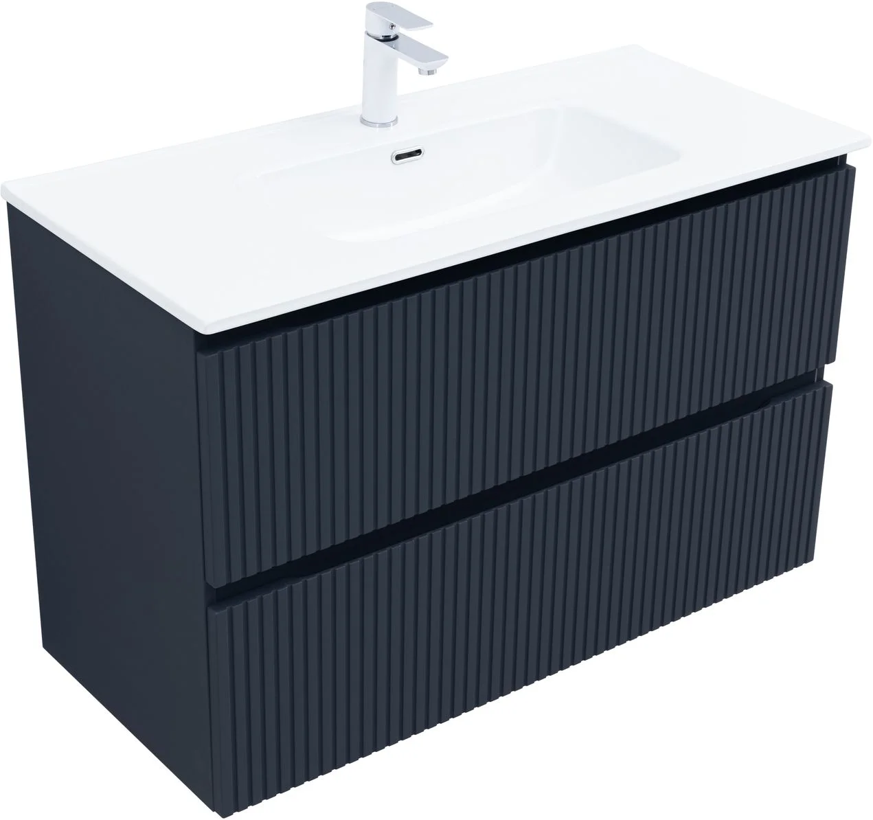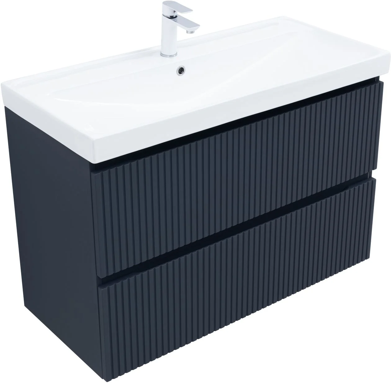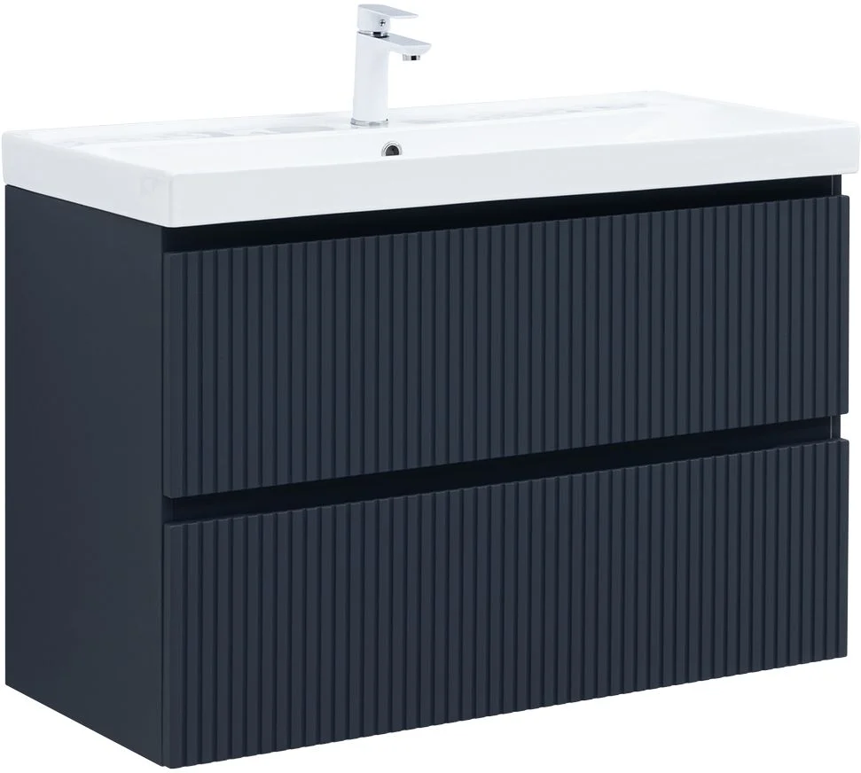 В характеристиках карточки указаны подвесной и напольный варианты монтажа. Размеры тумбы с раковиной: 1000x637x450 мм. Корпус и фасад выполнены из МДФ, покрытие пленка, фурнитура хром. Гарантия на изделие - 2 года.
