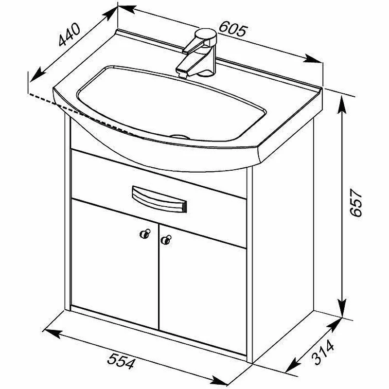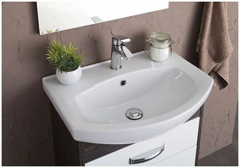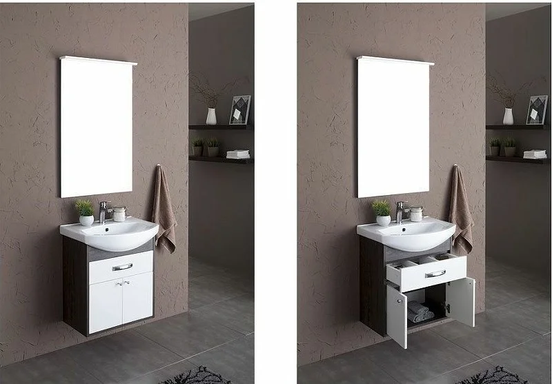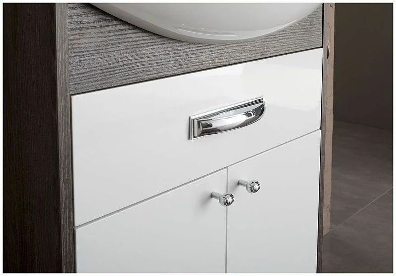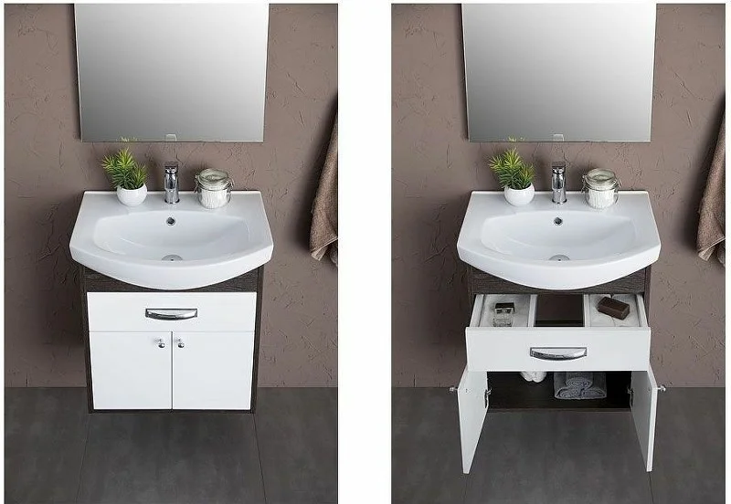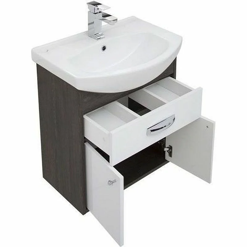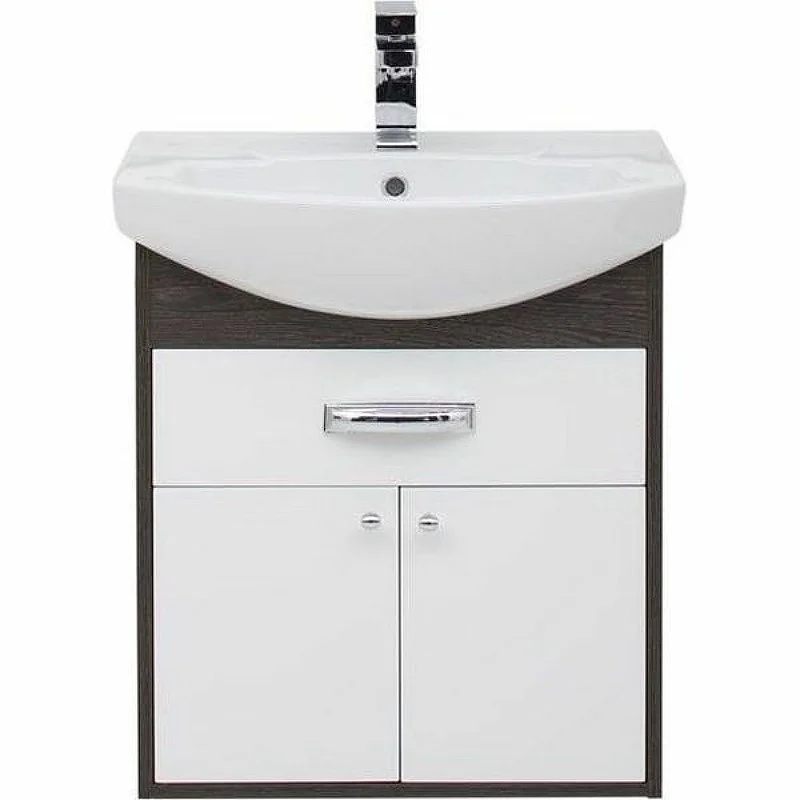 Тумба Aquanet Грейс 60, цвет - дуб кантербери/белый, (1 ящик, 2 дверцы) выполнена в цветовом сочетании белого глянца с древесной фактурой «дуб кантербери». Дуб кантербери темного цвета создает контрастные сочетания с белым, в результате чего фасад, установленный по типу вкладного, в окружении торцевых частей корпуса смотрится словно в элегантной рамке. Внутреннее пространство тумбы шириной 60 см очень функционально: выдвижной ящик вверху с отделениями под мелочь и распашные дверцы внизу с аккуратными круглыми ручками как кнопочки. В комплекте с тумбой предусмотрена керамическая раковина «Элеганс» с обрамлением. <