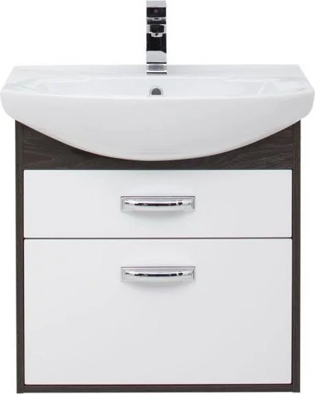 Тумба Aquanet Грейс 65, цвет - дуб кантербери/белый, (2 ящика) выполнена в цветовом сочетании белого глянца с древесной фактурой «дуб кантербери». Дуб кантербери темного цвета создает контрастные сочетания с белым, в результате чего фасад, установленный по типу вкладного, в окружении торцевых частей корпуса смотрится словно в элегантной рамке. Тумба шириной 65 см комплектуется двумя выдвижными ящиками, из которых один глубже и предназначен для хранения тюбиков и флаконов, другой поменьше и разделен на секции, куда можно разложить мелкие предметы. В тумбе нижний выдвижной ящик изготавливается без выреза под сифон. В комплекте с тумбой идет керамическая раковина «Элеганс» с обрамлением. <