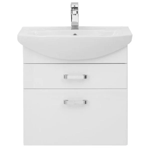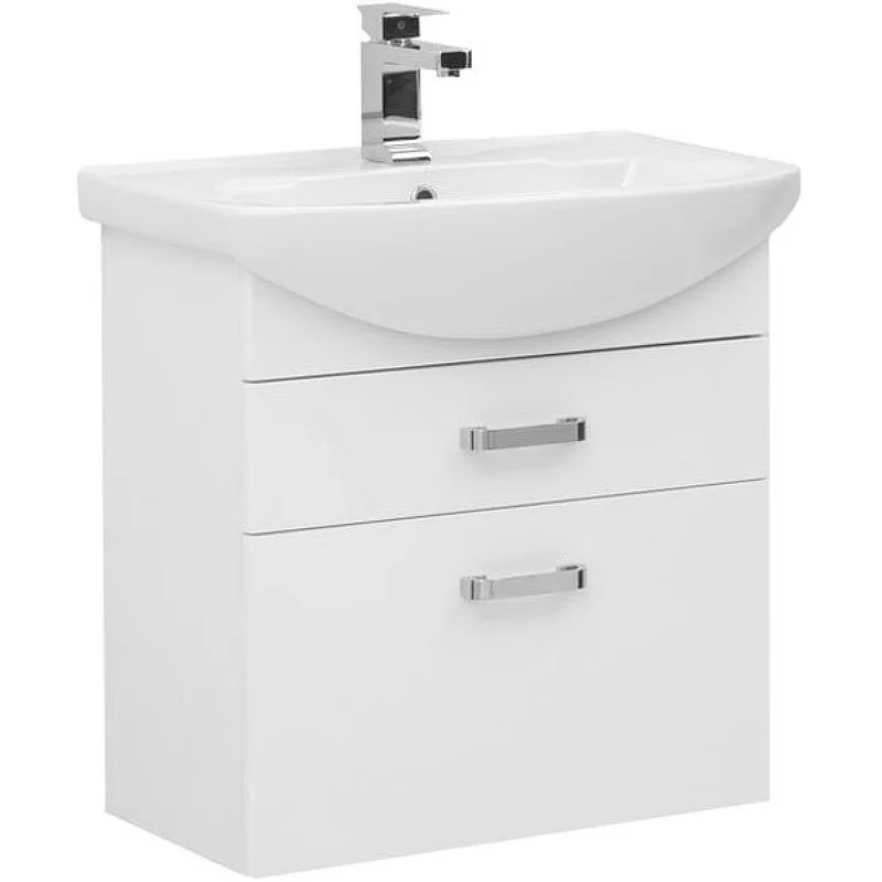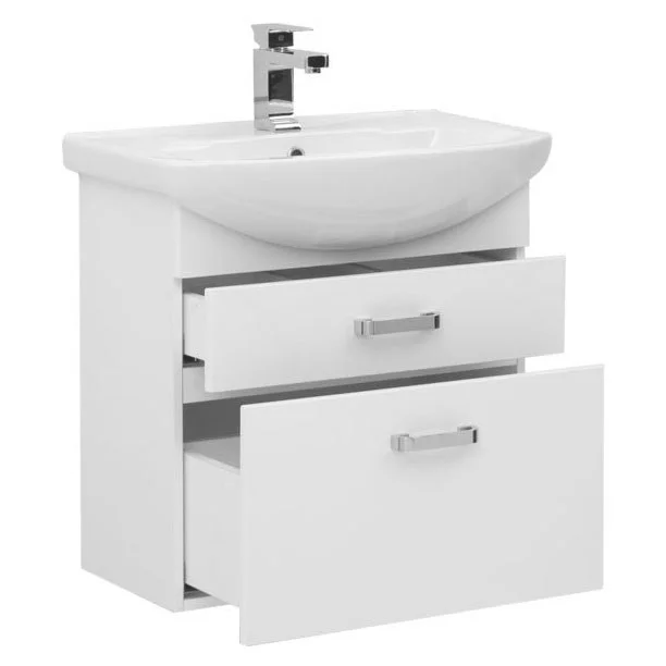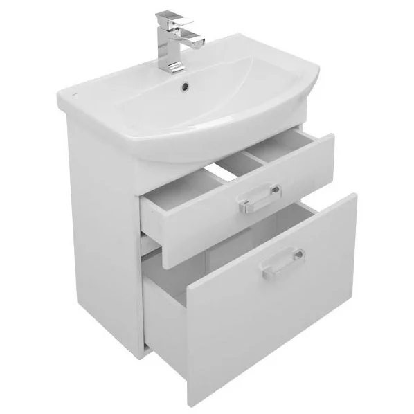 Тумба Aquanet Ирис 65, цвет - белый, (2 ящика) отвечает всем основным покупательским предпочтениям. Во-первых, выполнена она в белом цвете – самом востребованном для обустройства санитарно-бытовых помещений. Во-вторых, радует экономных покупателей очень привлекательной ценой. В-третьих, изготовлена из влагостойких материалов: корпус тумбы – из ЛДСП, а фасады – из МДФ. Тумба шириной 65 см имеет универсальный тип установки. Ее можно подвесить или установить на ножки – оба варианта предусмотрены. Тумба комплектуется двумя выдвижными ящиками, из которых один глубже и предназначен для хранения тюбиков и флаконов, другой поменьше и разделен на секции, куда можно разложить мелкие предметы. В тумбе нижний выдвижной ящик изготавливается без выреза под сифон. В комплекте с тумбой идет керамическая раковина «Элеганс» с обрамлением. <