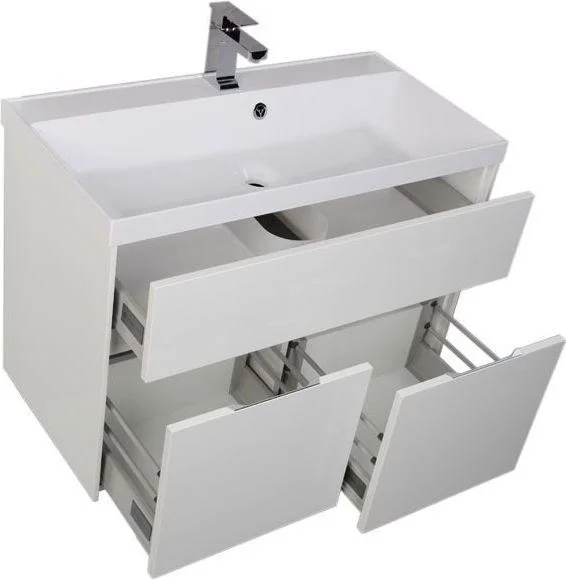 Тумба с раковиной Акванет Латина — новое предложение для тех, кто решил создать ванную комнату в стиле «модерн». Современные лаконичные формы такой мебели позволяют оснащать даже небольшие по площади ванные комнаты весьма рационально. Вместительные отделения трех выдвижных ящиков тумбы и полок за распашной дверцей сокроют в себе белье и полотенца. Ящики новых коллекций мебели Aquanet снабжены доводчиками плавного закрывания. Среди достоинств комплекта также хромированные ручки ящиков и глубокая прямоугольная раковина из литьевого мрамора, что очень актуально для современных интерьеров.