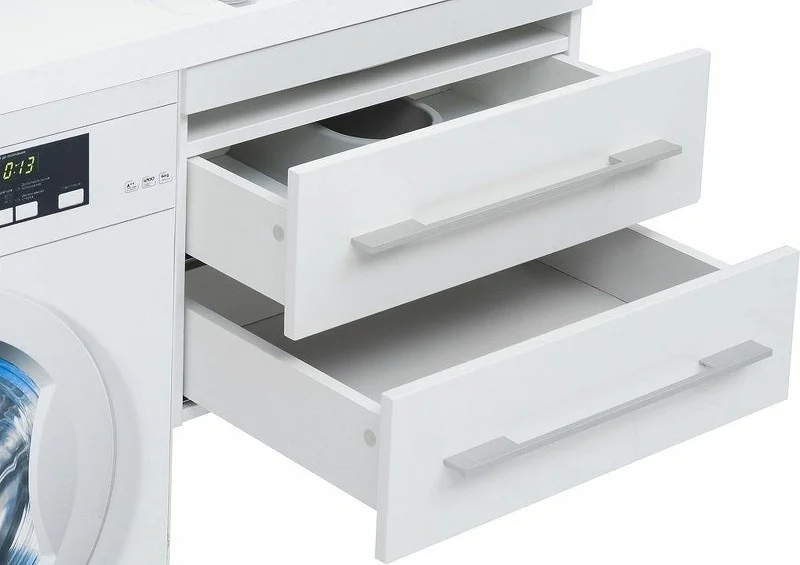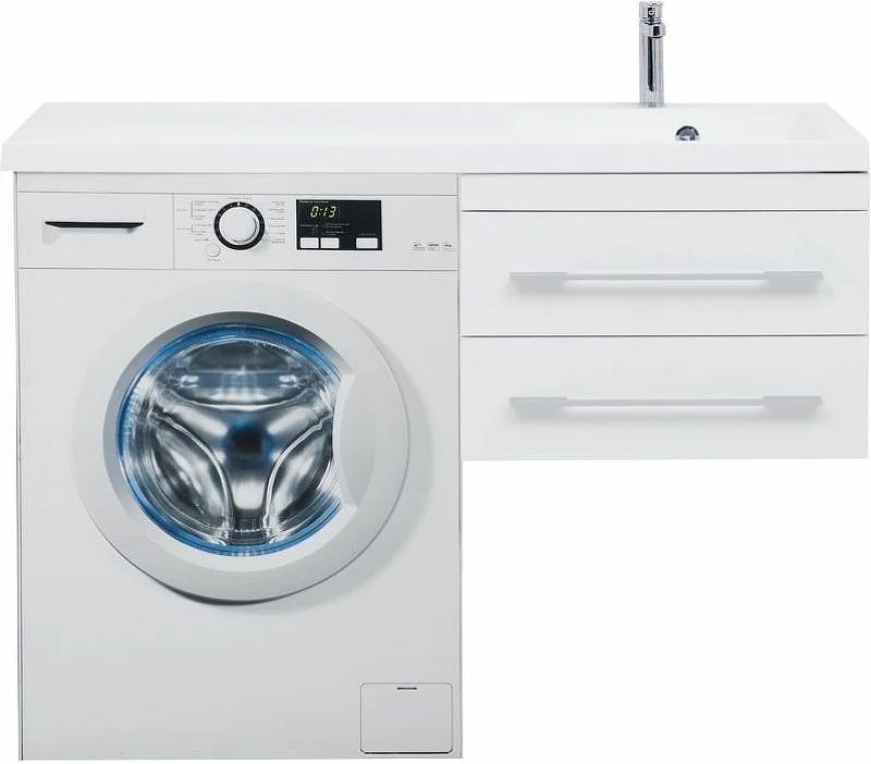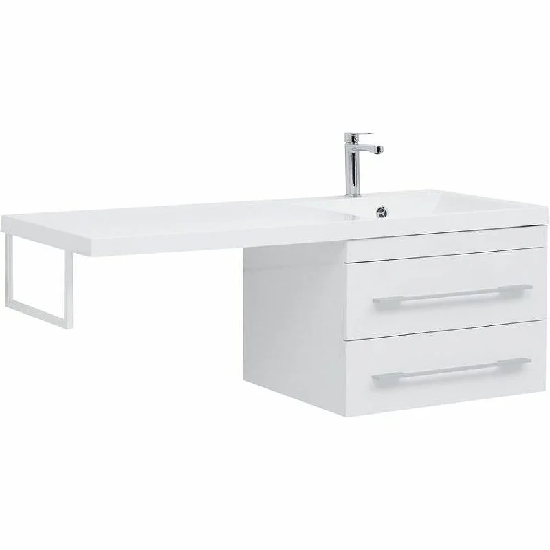 Подвесная тумба "Нота" в белом цвете имеет эффектный внешний вид. Конструкция облегчает уборку благодаря отсутствию ножек и обеспечивает место для хранения бытовых средств в двух глубоких ящиках. С использованием раковины "Нота" (Aquanet) из литьевого мрамора с длинной площадкой, предназначенной для установки под ней стиральной машины, тумба приобретает новую функциональную нагрузку и практичное значение. В данной модели место для стиральной машины предусмотрено слева.