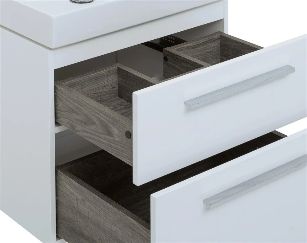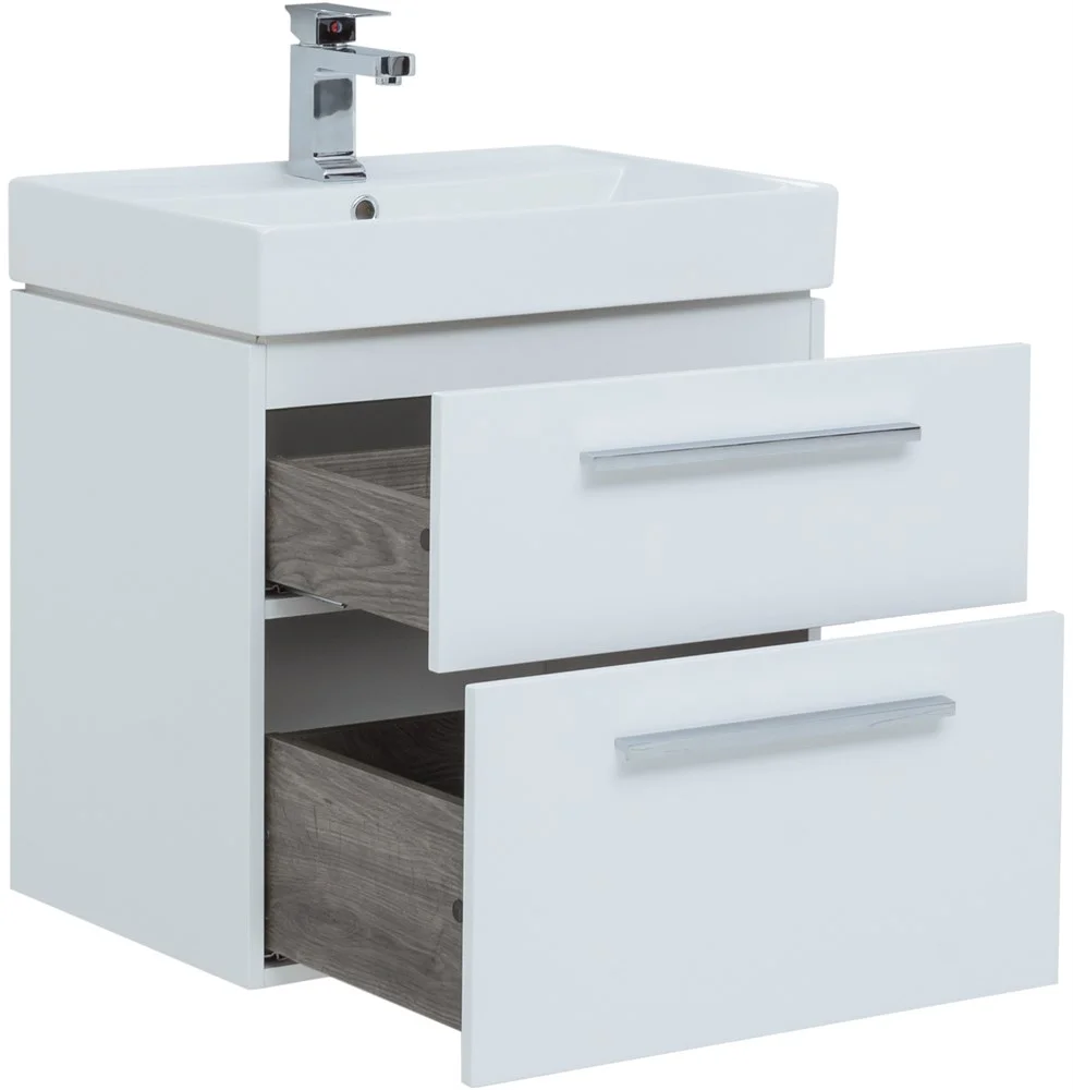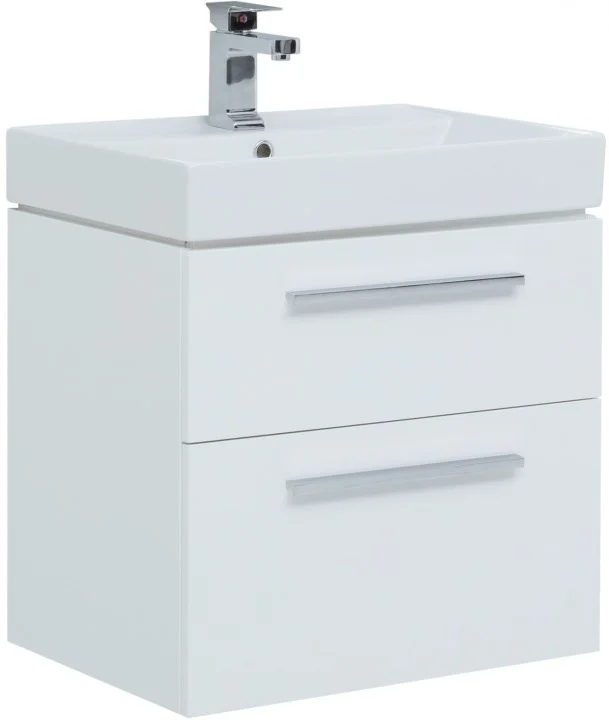 Тумба с раковиной Aquanet Nova 60 белый (2 ящика) имеет белоснежную глянцевую поверхность Она изготовлена из влагостойкой ламинированной древесно-стружечной плиты и предназначена для использования в помещениях с повышенной влажностью. Цветовым акцентом тумбы служит фактура выдвижных ящиков. Они выполнены в цвете «дуб рошелье» и эффектно контрастируют с белоснежным глянцем фасадов. Тумбу Nova можно установить на стену, тем самым под ним будет свободное пространство, что особенно удобно при уборке помещения. Также можно установить ее на ножки. Для этого их необходимо приобрести дополнительно. Причем, есть выбор: купить белые ножки или черные матовые. В комплекте с тумбой - встраиваемая керамическая раковина «Латина». Эта модель выпускается исключительно для мебели Aquanet. Чаша раковины внутри имеет обтекаемую форму и небольшую платформу с отверстием для смесителя. На нее можно поставить гигиенические принадлежности. Шкафчики тумбы оборудованы надежными направляющими Hettich Quadro Silent System, которые обеспе